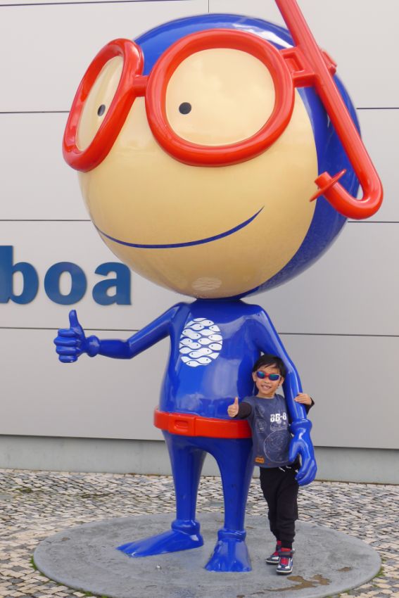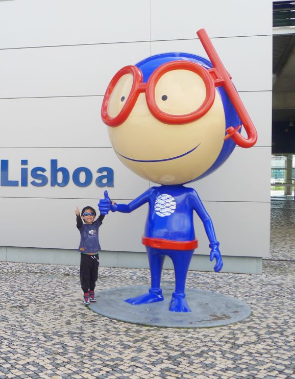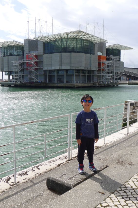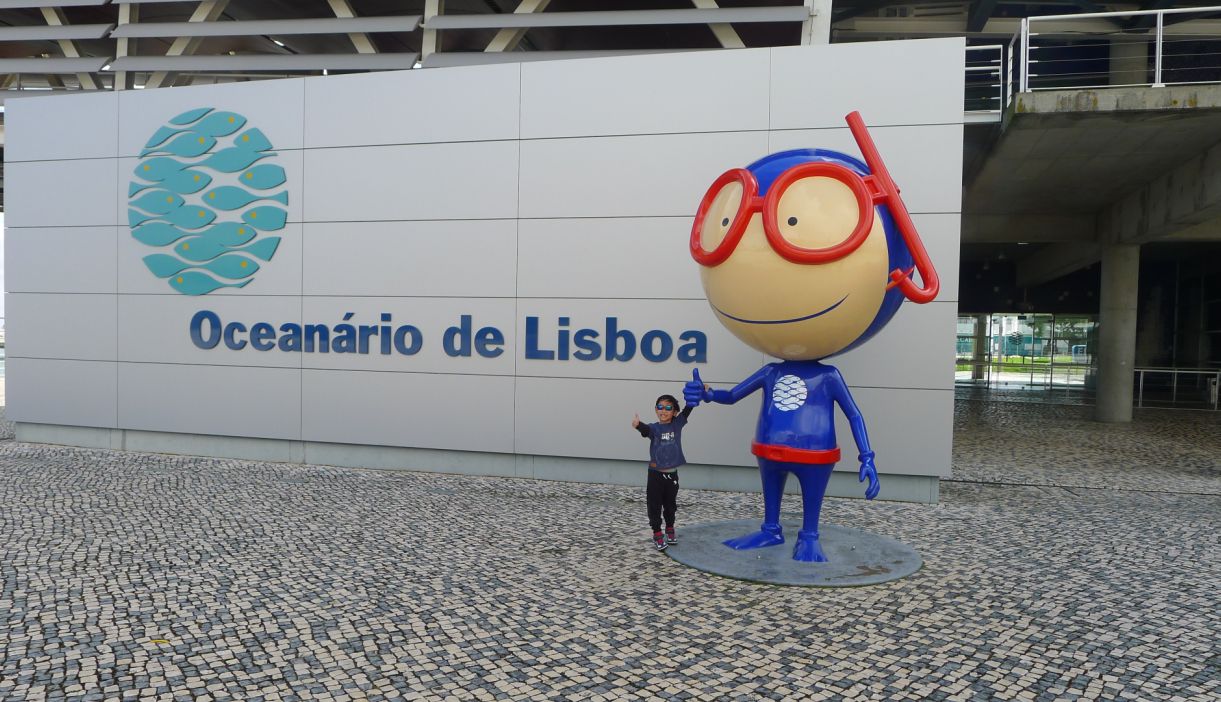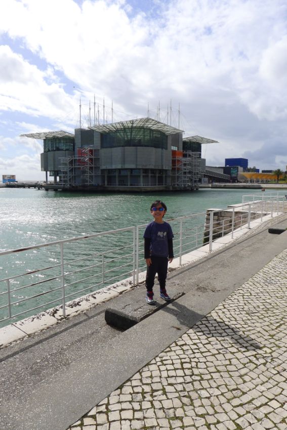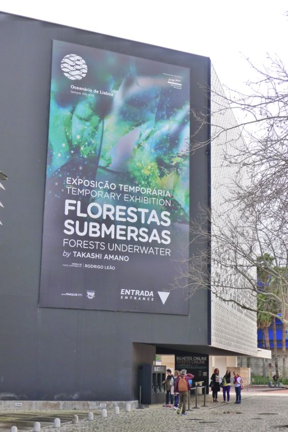 This the front of the entrance of the Lisbon Oceanarium. Lots of students are waiting there to get in.