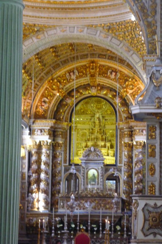 The profusely decorated gilded arch shows the small statue of Nossa Senhora da Nazaré in a lit niche above the main altar, flanked by twisted columns. |