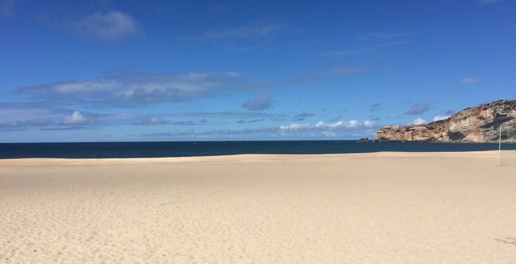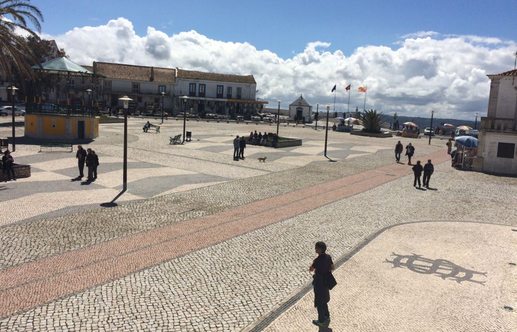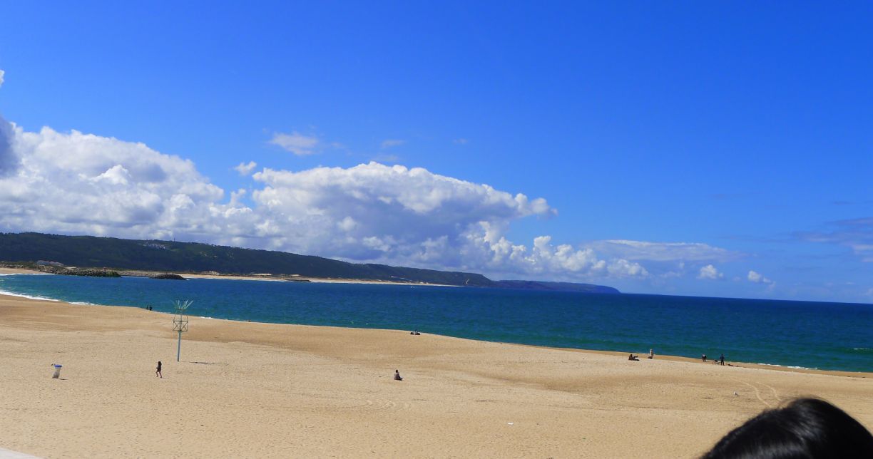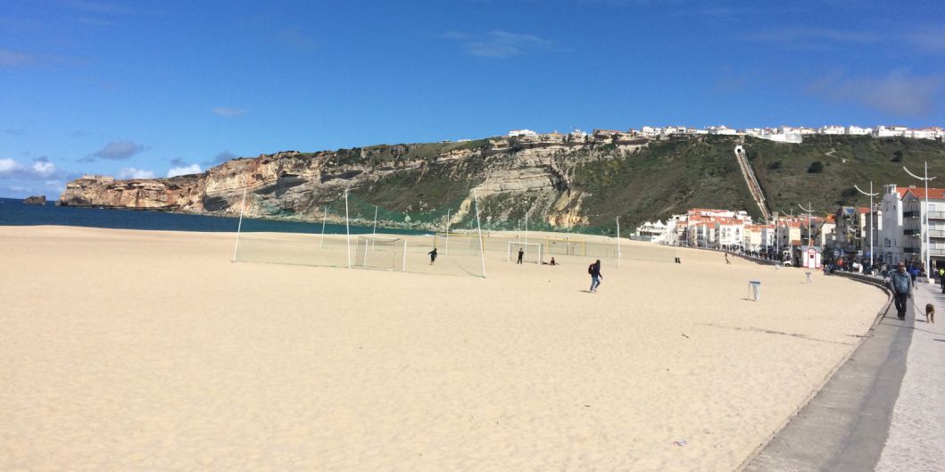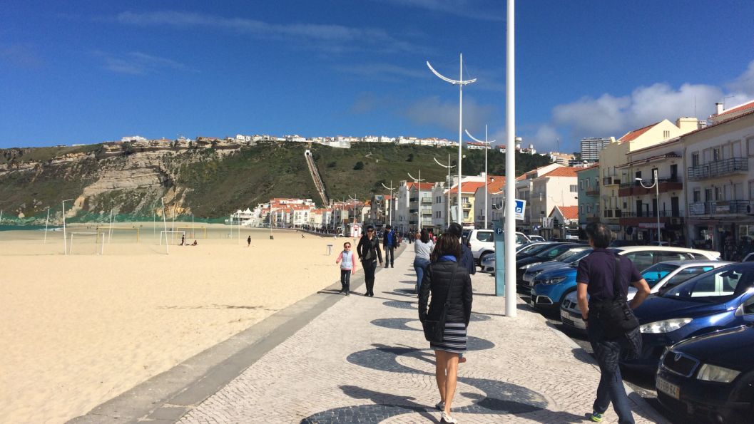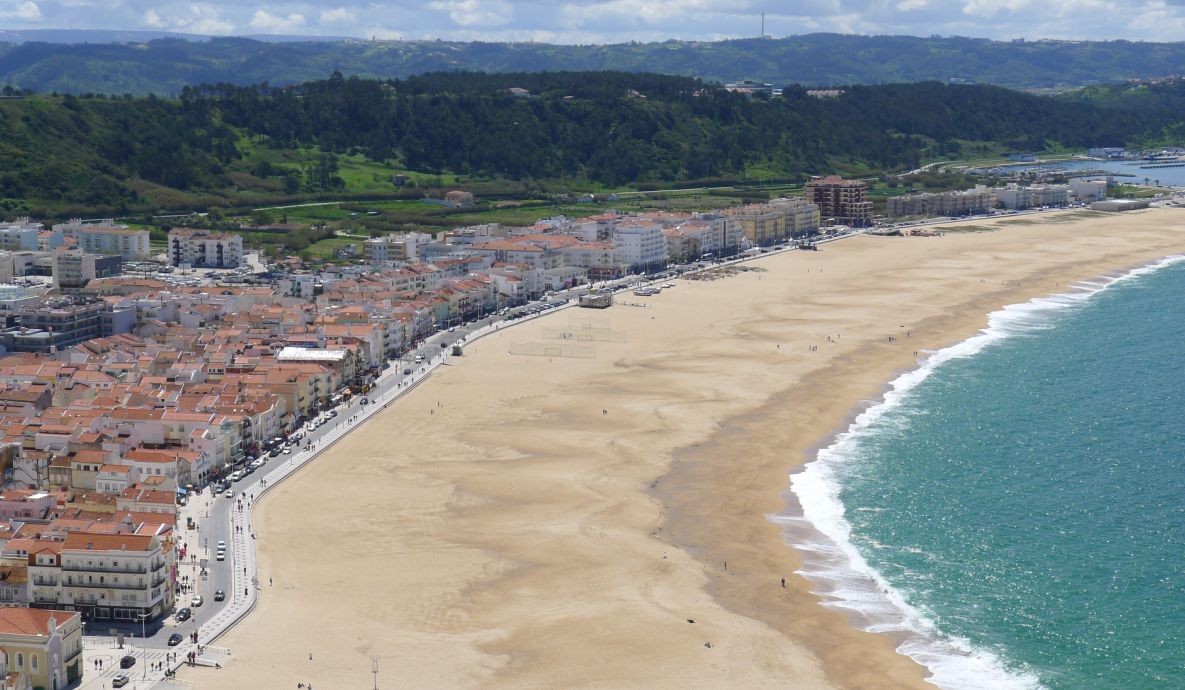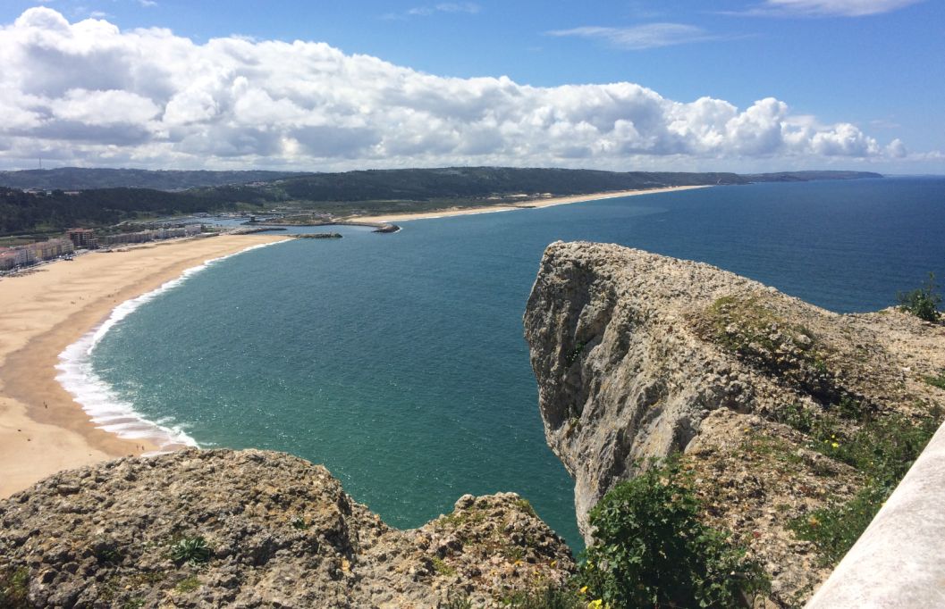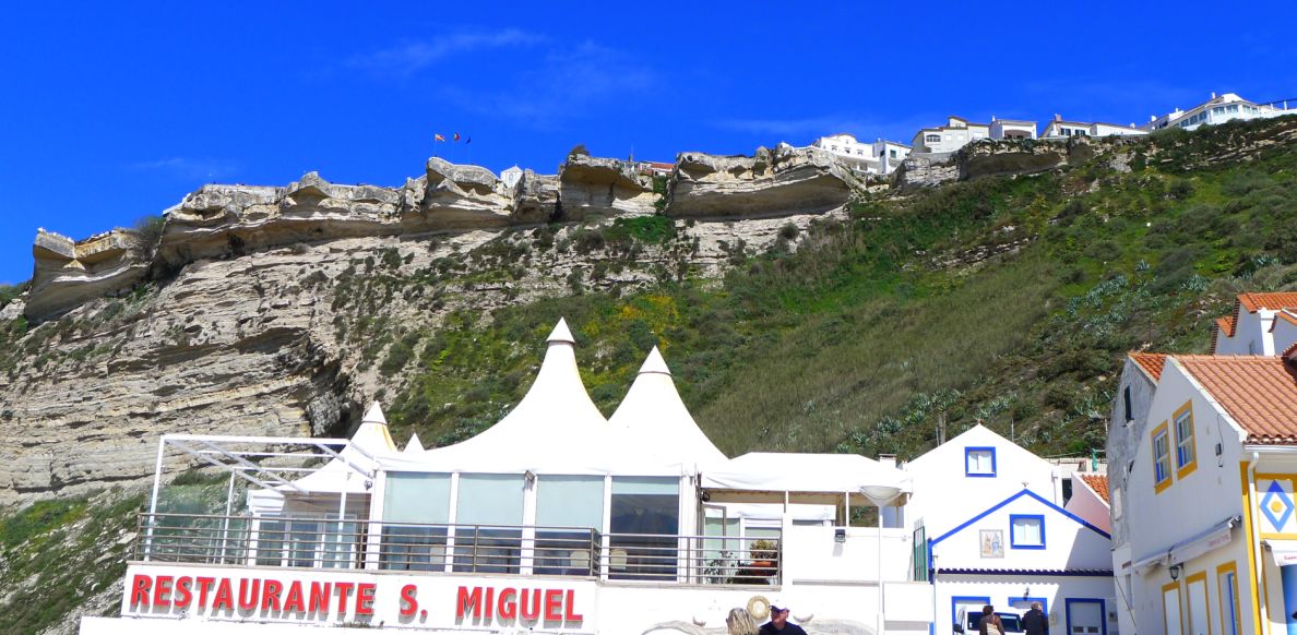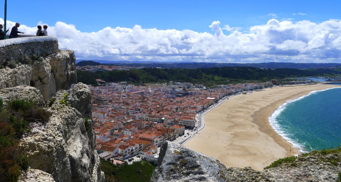 We are now on at the edge of the buff, below you can see Nazaré and its golden beach stretching all the way to the new harbor.