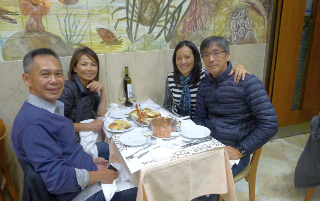 Our table was very small so Hoa gave our waiter the sign to take it away. At first our waiter took the bottle away but left the bucket on the table? We thought the waiter was weird if you are going to clean up you should take the bucket and bottle away... but then he came back with a brand new bottle for us! What!! He totally misunderstood Hoa. We told him to take it away and he thought we wanted a new bottle. We laugh so hard but we kept it anyway! There is not way we could drink a 2nd bottle so Hoa went around and offer the wine to a couple and their daughter who came to visit Portugal from South America. It makes everybody happy! |