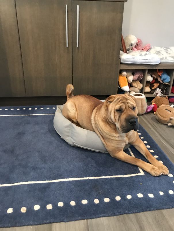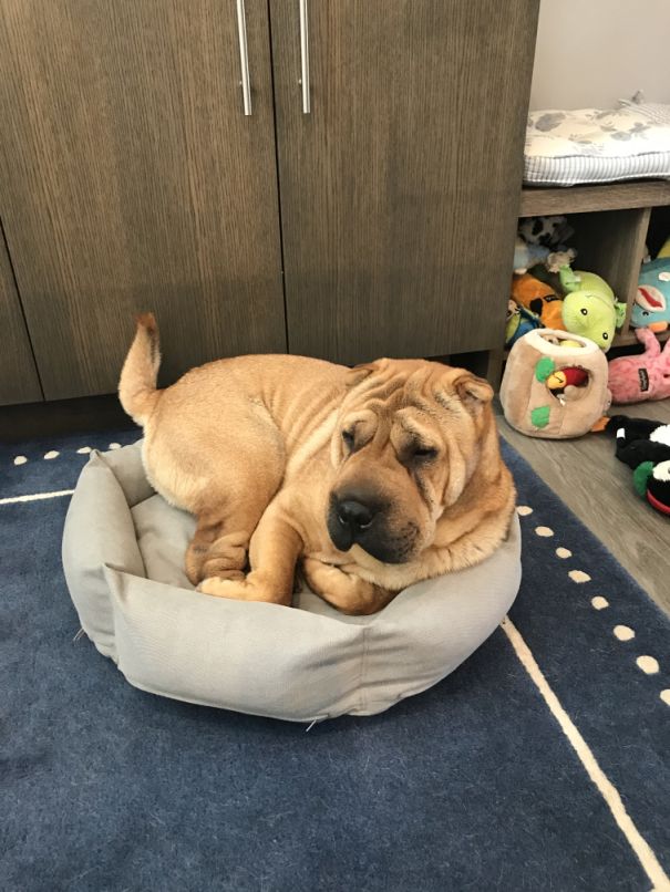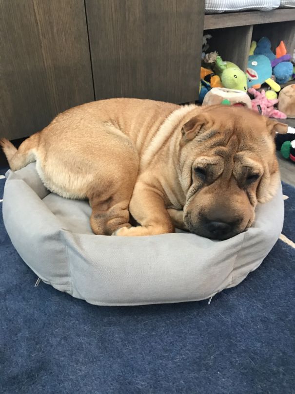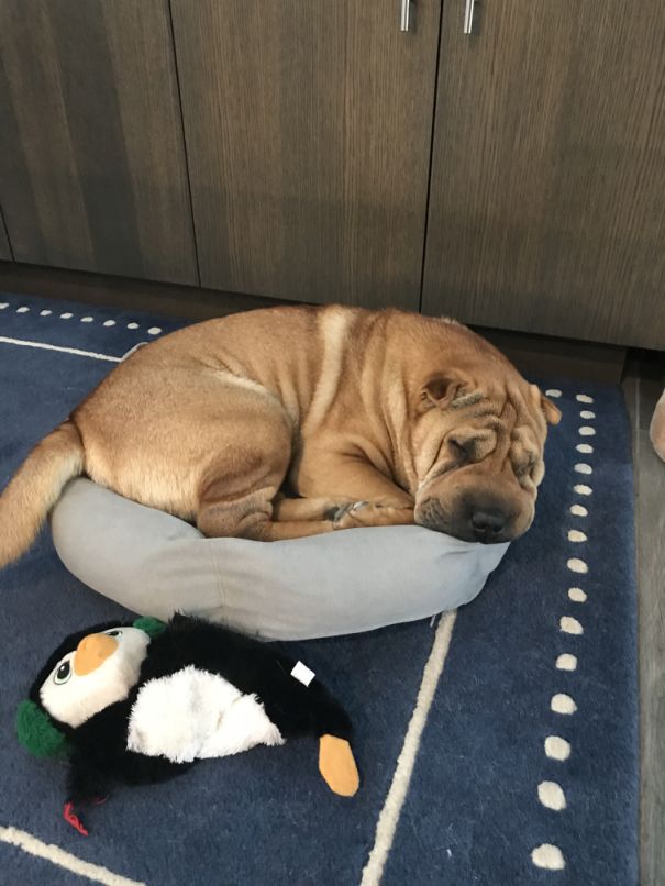 For some reason he likes to be in a small bed! Half of his body is outside the bed but he does not mind.