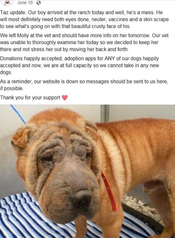 ![]() This is a post for the California Sharpei rescue when they got Taz. He was a mess with a skin condition, he had Entropian (eye lid problems), and he always needed to be neuter. |