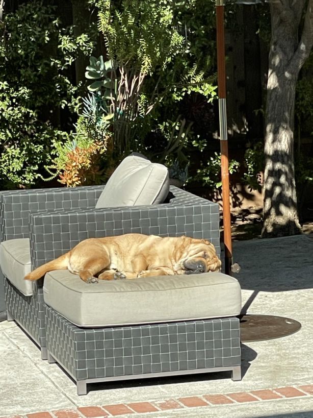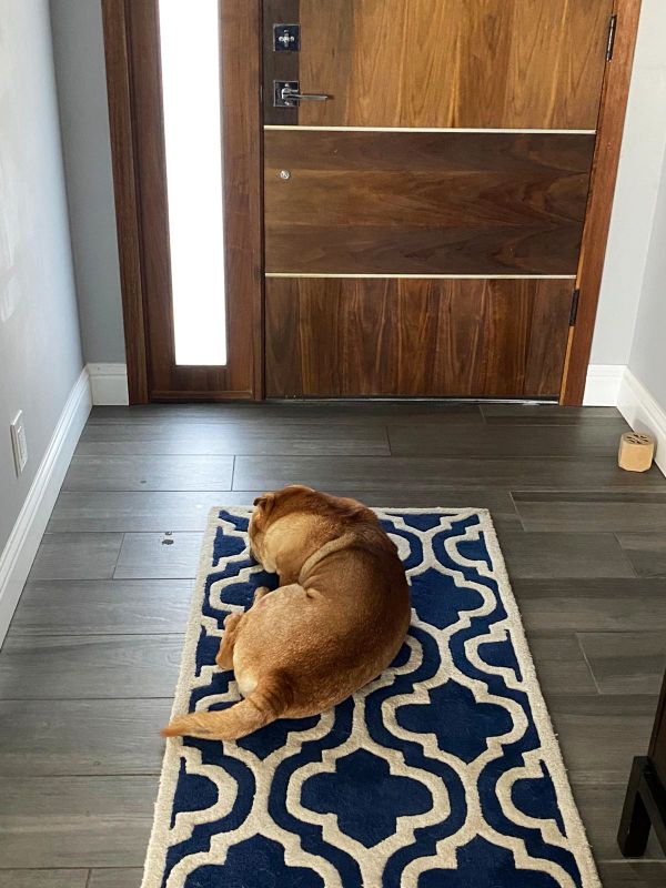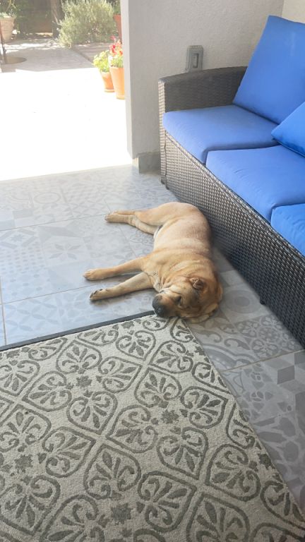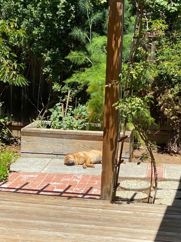 When it is too hot and he wants to lay in the shade, this is his favorite area, right at the door going into the backyard.