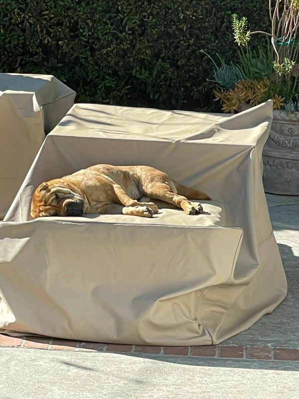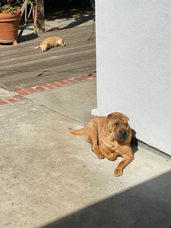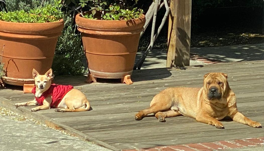 In the winter, the cement is too cold so Dora and Taz are usually up on the table to sun bathe.