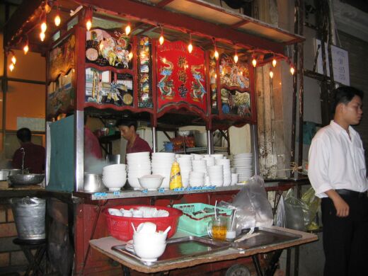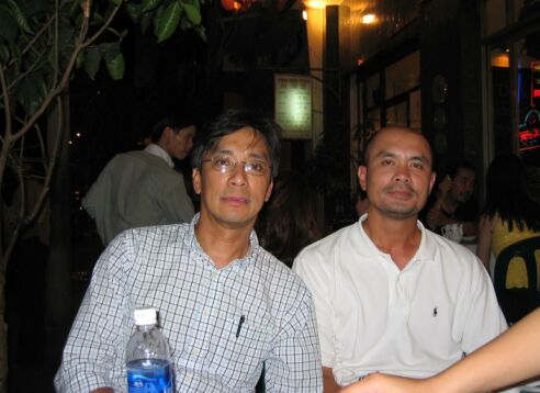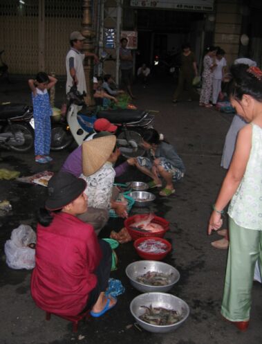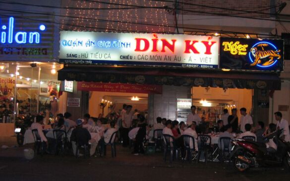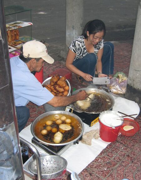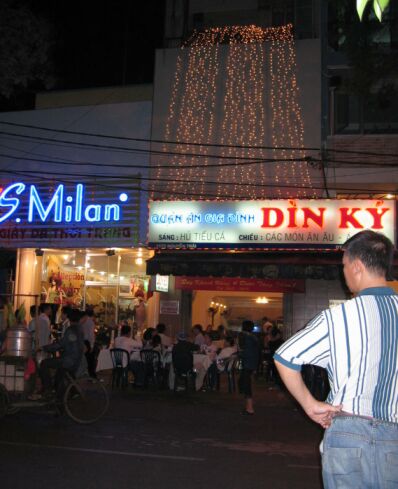 Here we have Hoa and Tung ordering a Bowl of Mi. Tables are set outside on the street. |