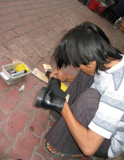 Shoe shining and repairing the sole - cost 25 cents. Hoa gave him $1.00, he was so happy and thought he had a great start earning his day! |