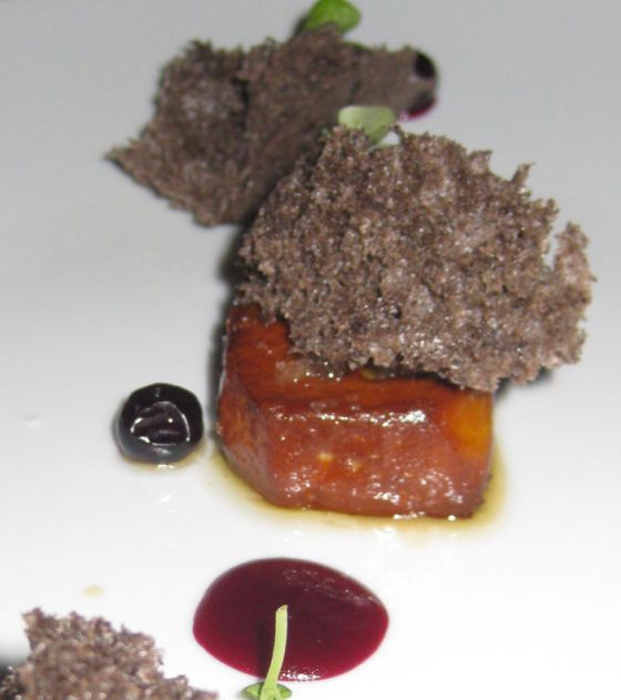 Transitioning from savories to sweets, we were served a hibiscus and raspberry sorbet palate cleanser. The little Dippin’ Dots were made using liquid nitrogen. Nothing fancy here..taste like dipping dots or something like that. |