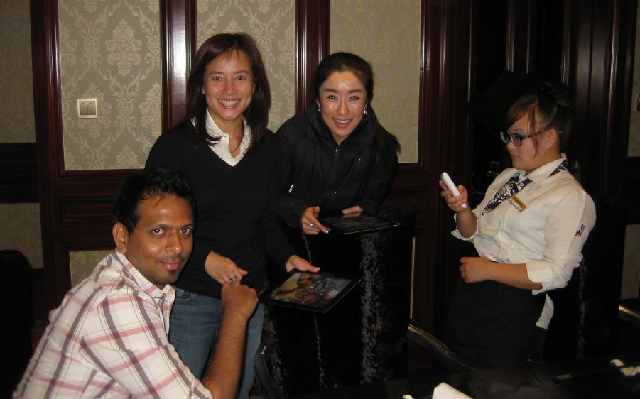Noticed that Anita and Jane are holding an android tablet to order the menu - No printed menu!