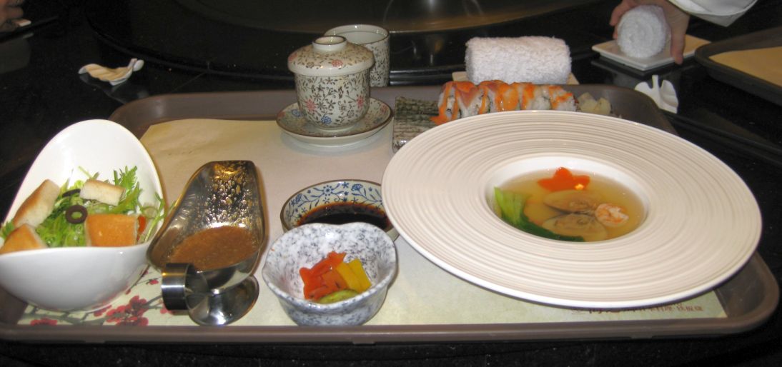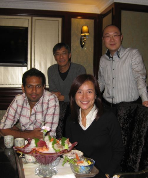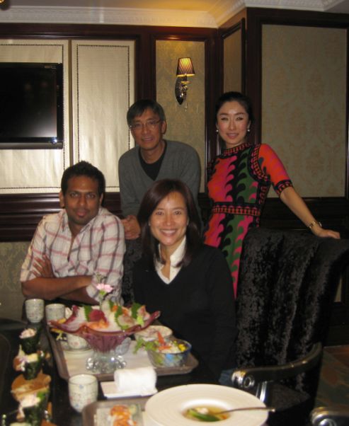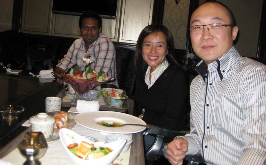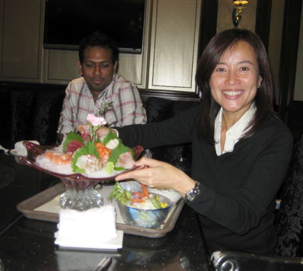 Dalian is close to the sea so the seafood is extremely fresh and good. Anita holding a plate of beautifully decorated sashimi platter. |