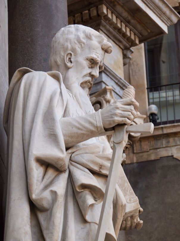Close up with of the statue of Saint Birillus on the left and Saint Euplius on the right. Both statues are located right at the entrance.