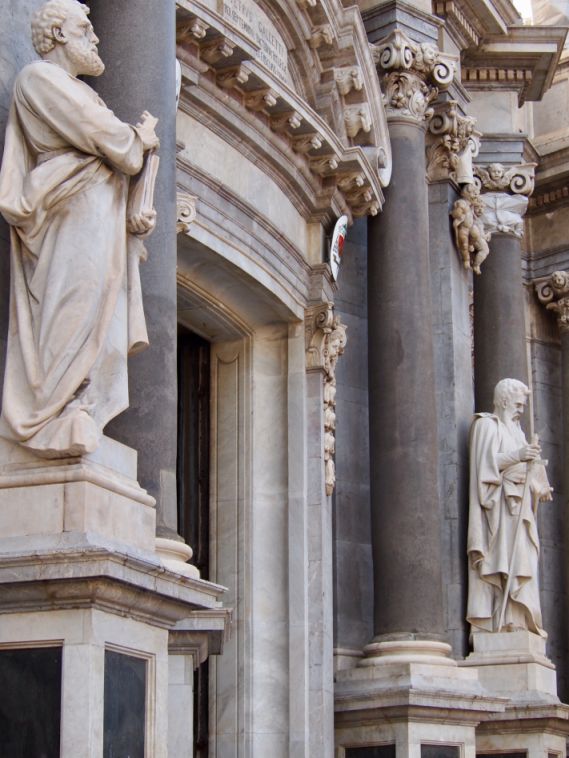 The current appearance of the cathedral dates from the work in 1711 of Gian Battista Vaccarini, who designed a new Baroque façade after the 1693 earthquake. It has three levels with Corinthian columns in granite. All the orders are decorated with marble statues of Saint Agatha over the gate, Saint Euplius on the right and Saint Birillus on the left.