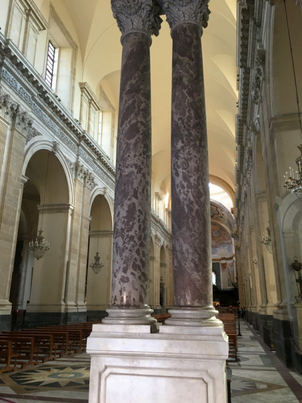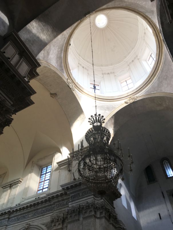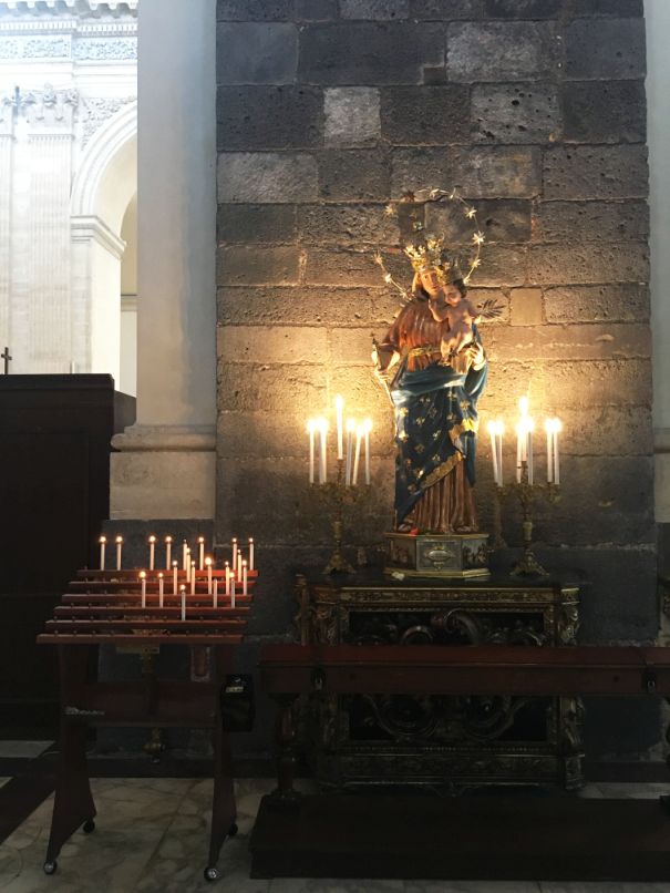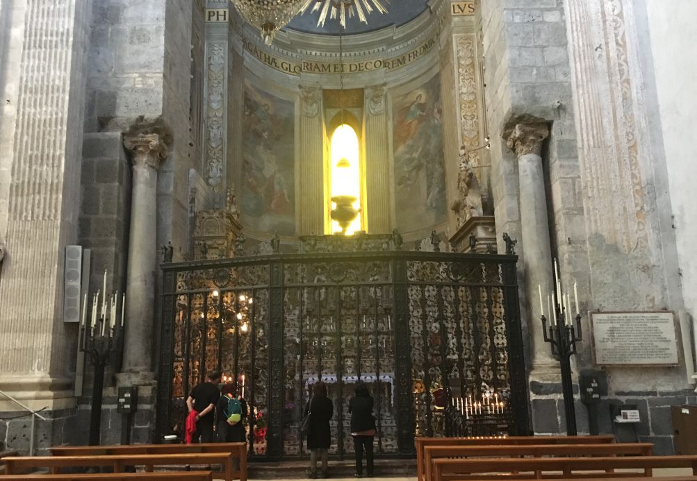 Saint Agatha is honored here in the place of her martyrdom. She is one of seven women, who along with the Blessed Virgin Mary, are commemorated by name in the Canon of the Mass. Born to a noble family in Catania, she spent a certain amount of time on the island of Malta before deciding that she should return to her native Catania to help spread the gospel. Roman prefect Quintianus at that time had taken a liking to her and wanted her to marry him, but when she rebuffed him, he sent her to a brothel and then, when she resisted all attempts to participate, he had her tortured by cutting off her breasts (hence she is patron saint of breast cancer patients, among others) in addition to other torments.