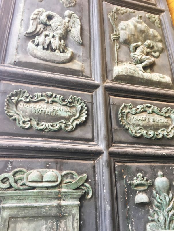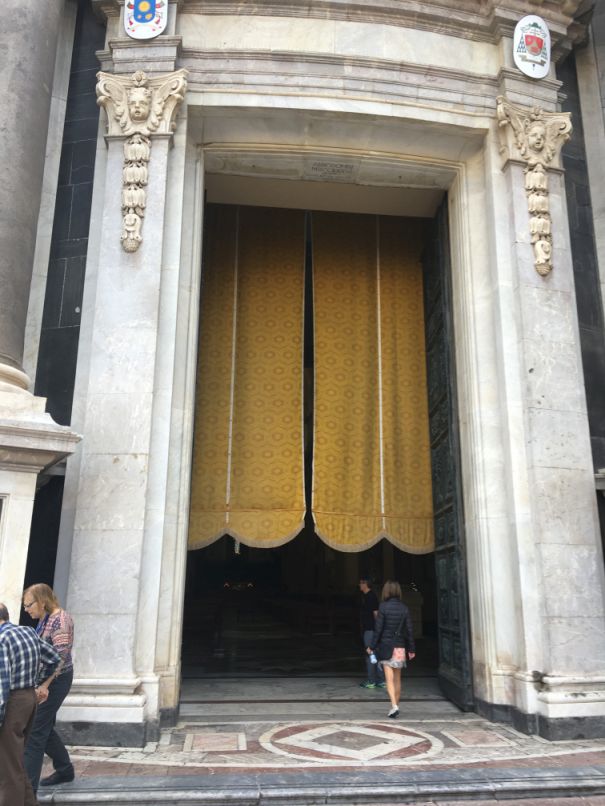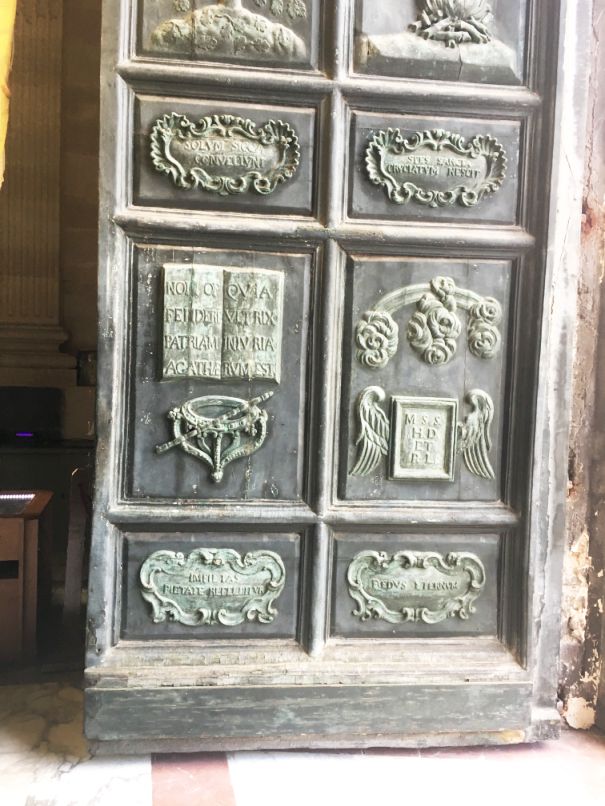 The main door made of wood has 32 sculpted plaques with episodes of the life and martyrdom of Saint Agatha, papal coats of arms and symbols of Christianity.