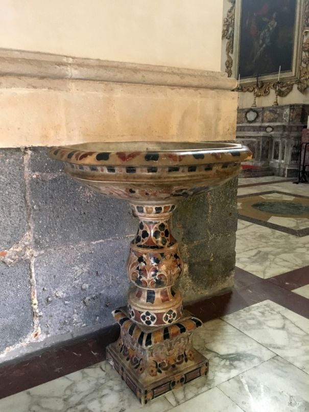 Holy water urn. This one looks like it has Arabic influence. |
