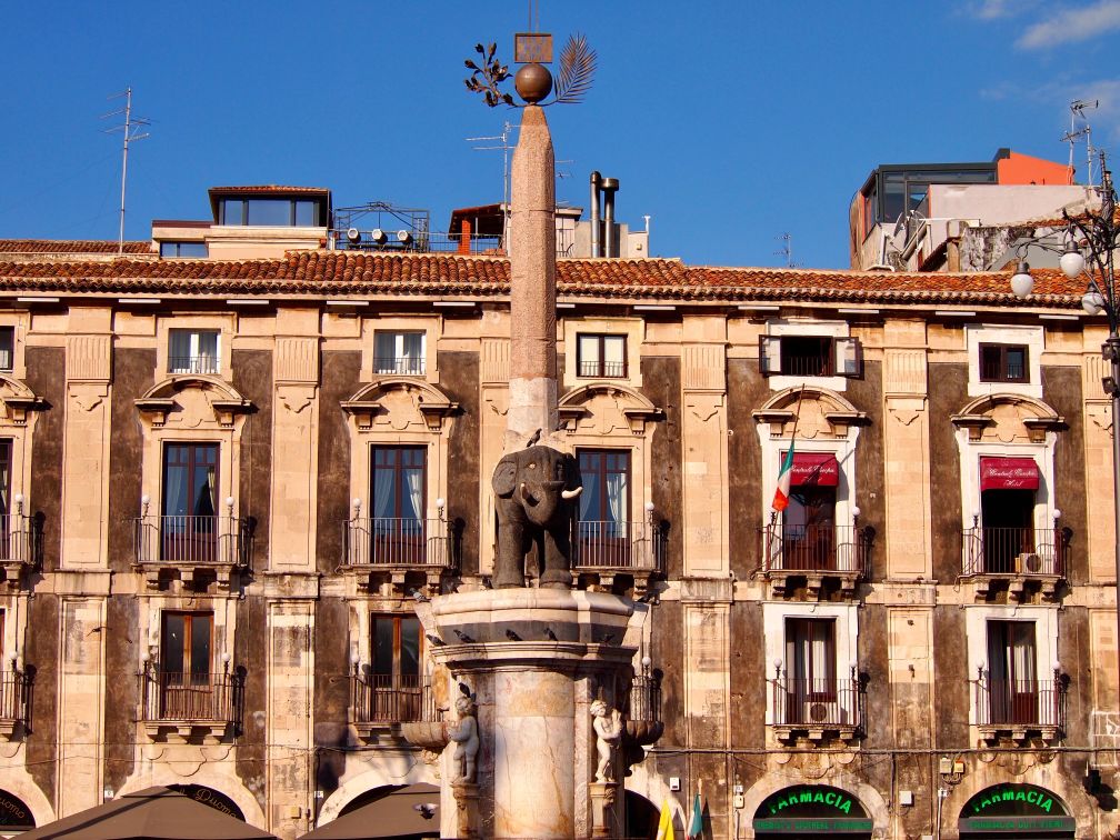The Elephant fountain is surrounded by the Palazzo del Municipio (left) and Palazzo degli Elefanti "Elephants Palace" on the right,