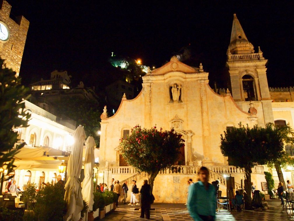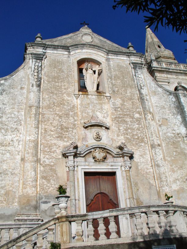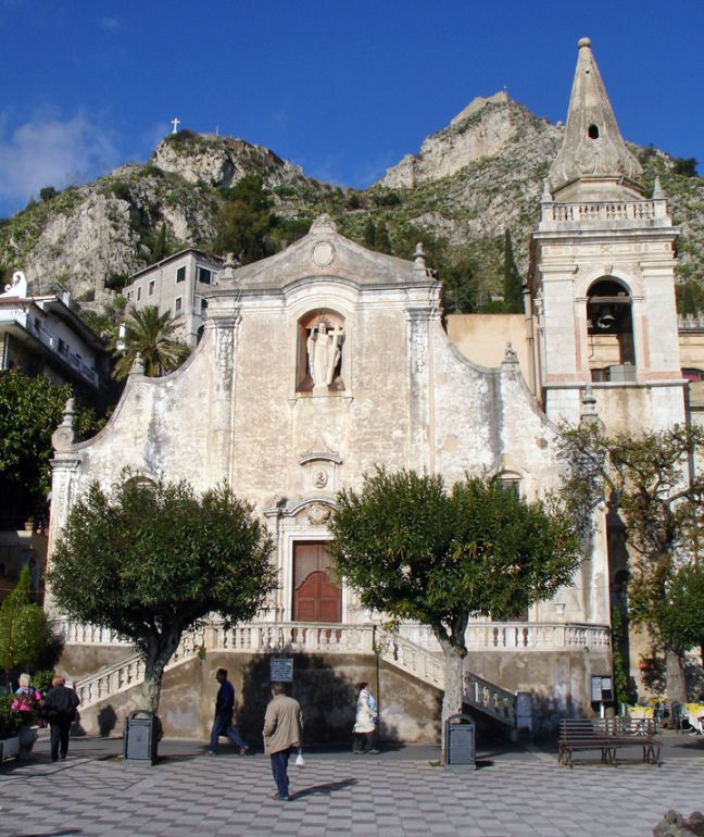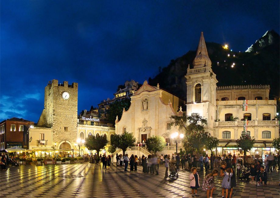 The main characteristic feature of the plaza is its black-and-white paving. The square is built in the form of a huge terrace from where you can enjoy breathtaking views of the Ionian sea and Mount Etna.