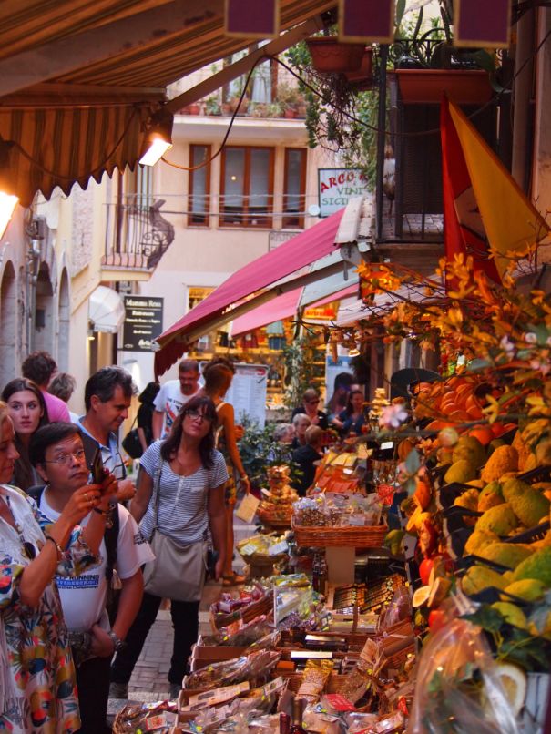 ![]() Tourists checking out fruits and goodies on the open street market. |
