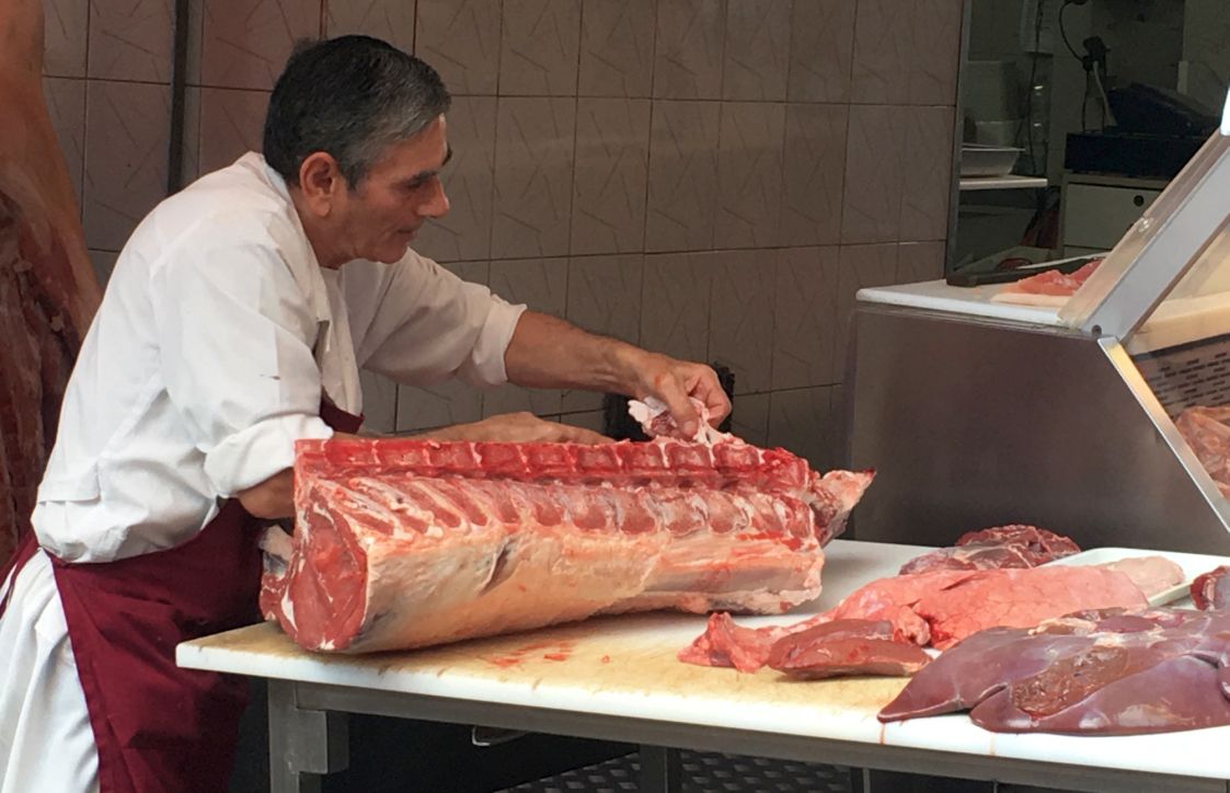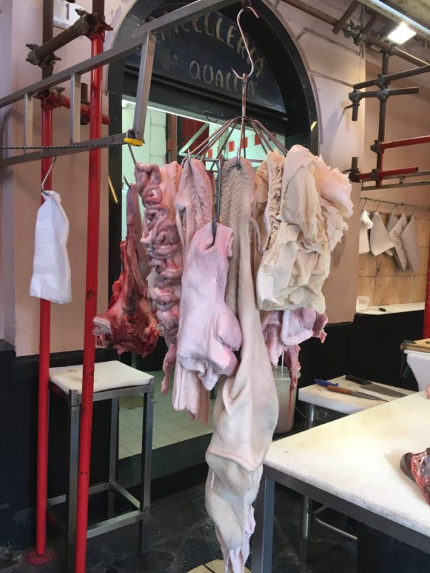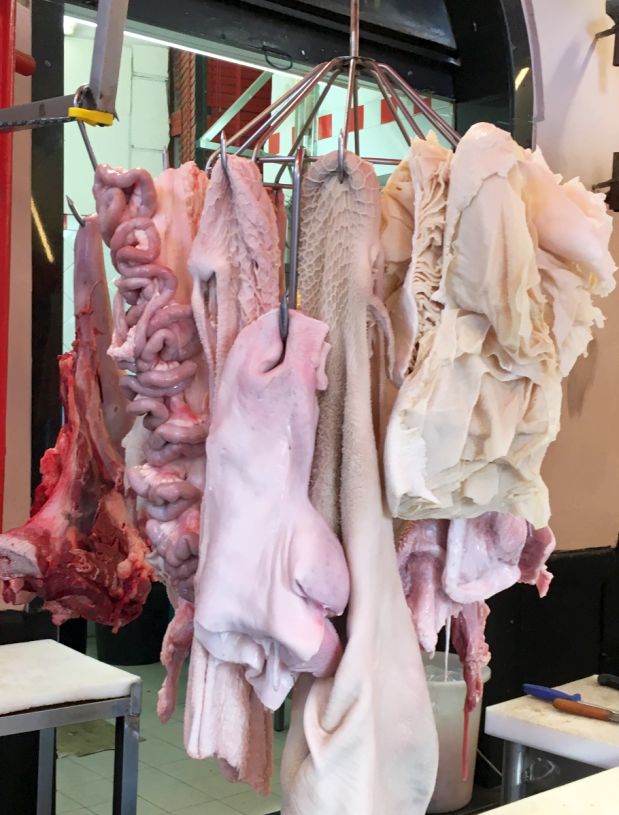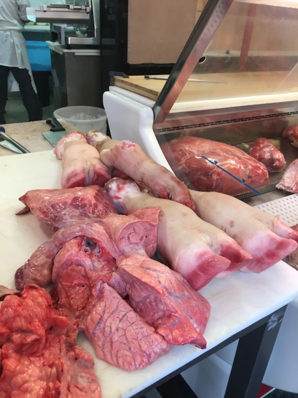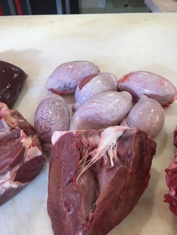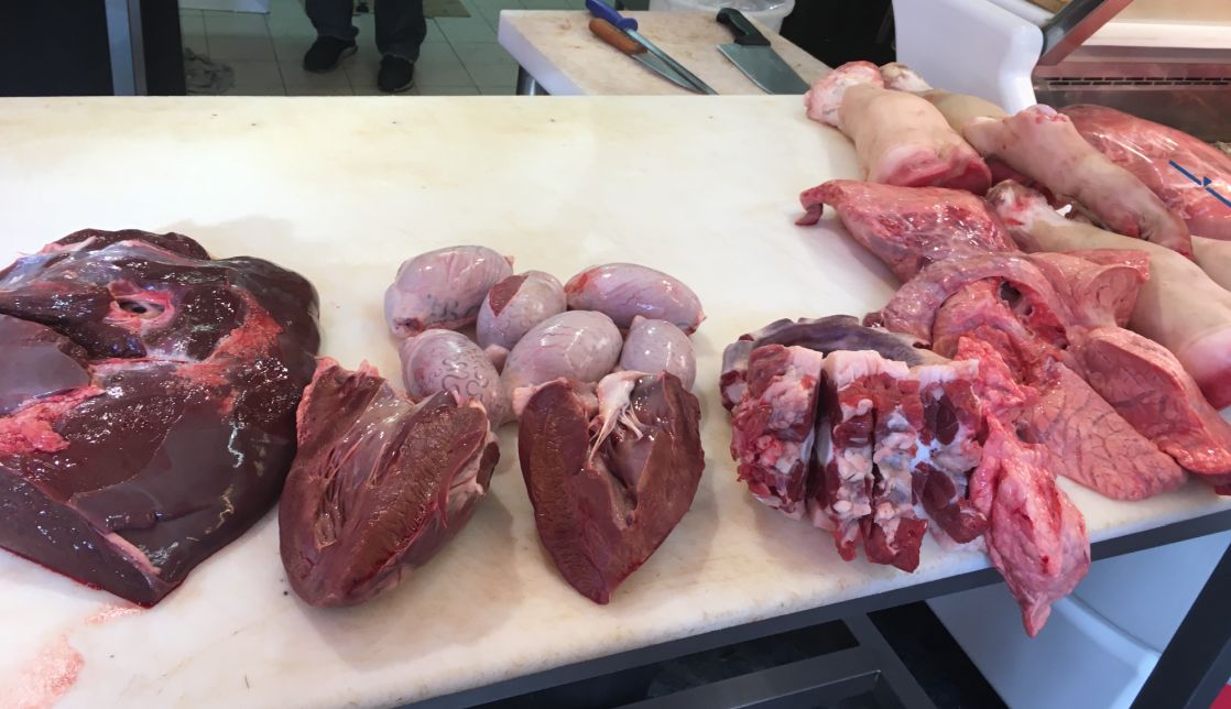 On the left: liver, heart, cow's testicle, neck bone, lung, and pig's feet.