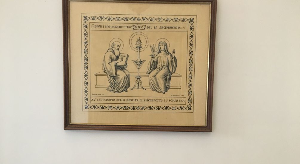 Framed picture of 15th century of the birth of Saint Benedetto and the blessed monastery.