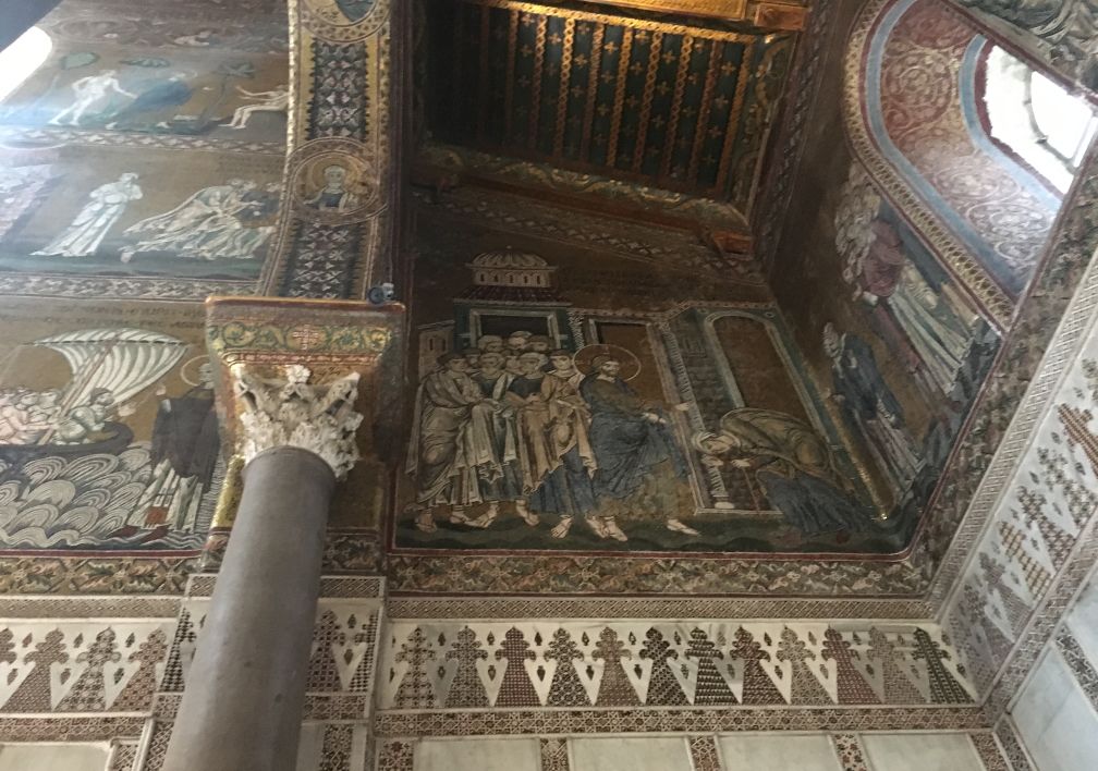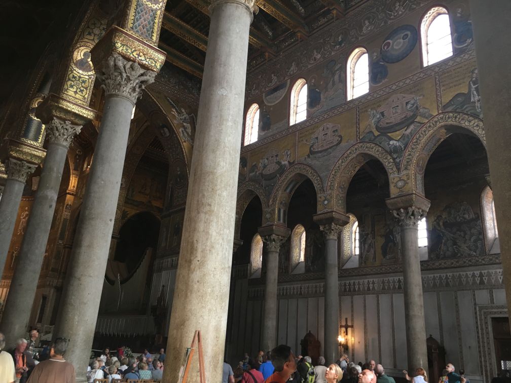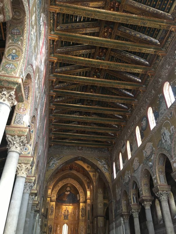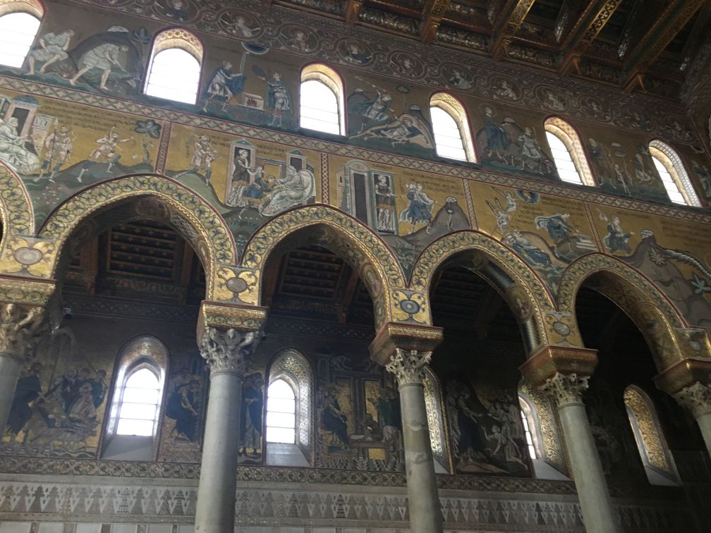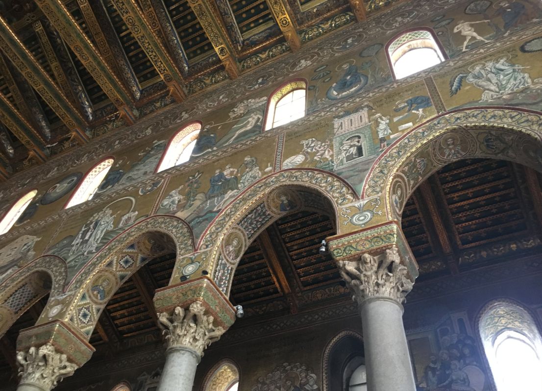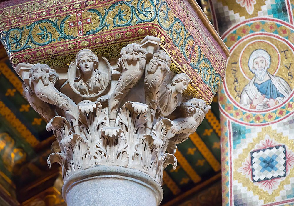 Decorated arches with golden mosaics. Take a look at examine the capitals on top of the supporting columns. They feature carvings of Sicily’s Norman history as well as figures of monsters and animals.