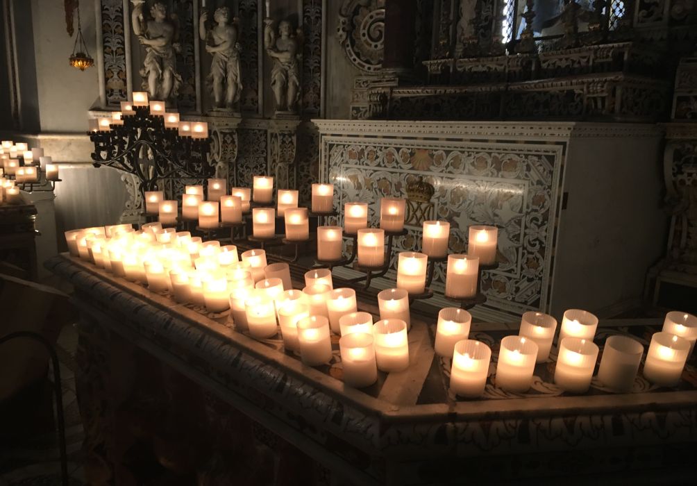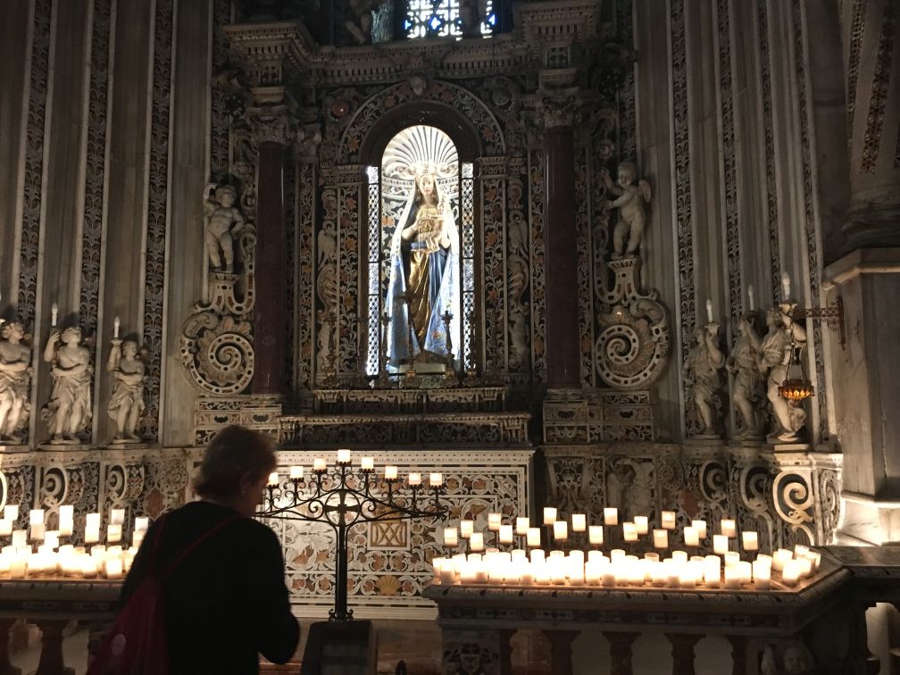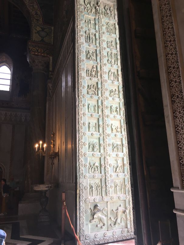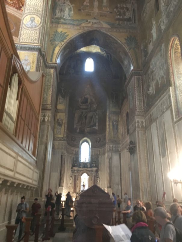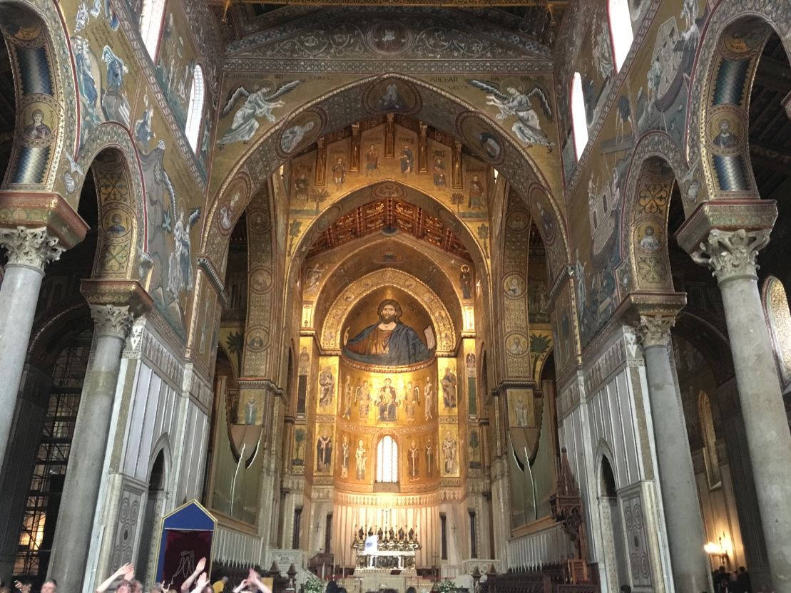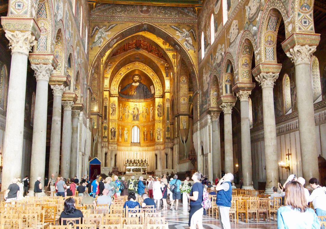 Decorated arches with golden mosaics. Take a look at examine the capitals on top of the supporting columns. They feature carvings of Sicily’s Norman history as well as figures of monsters and animals.