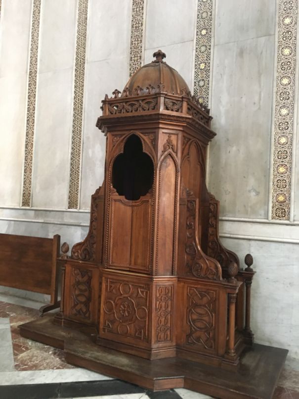 Each individual capital is sculpted with a different motif featuring religious figures and symbols. Only one of the eighteen columns is not made of gray granite, the first column on the right of the front entrance, which is made of "cipollina" marble