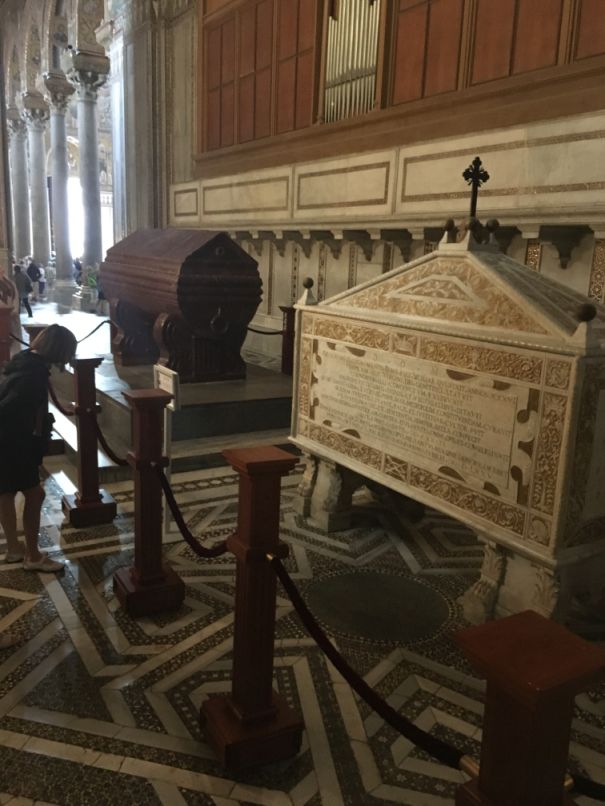 William's father, King William I "the Bad" lies in the deep-red porphyry tomb which dates from the twelfth century and is, presumably, his original. William II's mother, Margaret of Navarre, is also interred at Monreale. Curiously, so is the heart of King Louis IX of France (Saint Louis). The royal cortege stopped here for a funeral en route to France following Louis' death during the Tunisian Crusade (in 1270) when his less-saintly younger brother, Charles of Anjou, was king of Naples and Sicily.