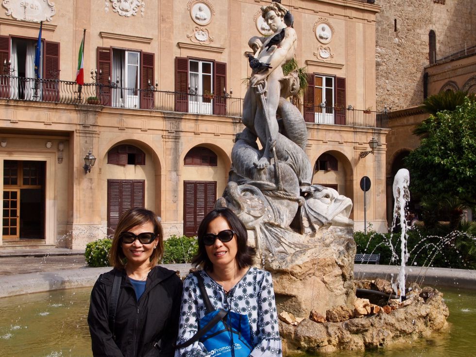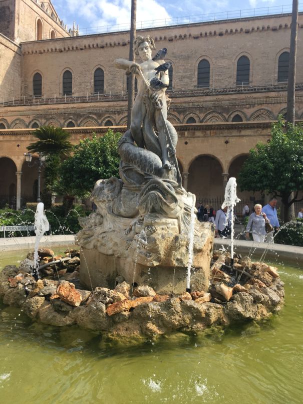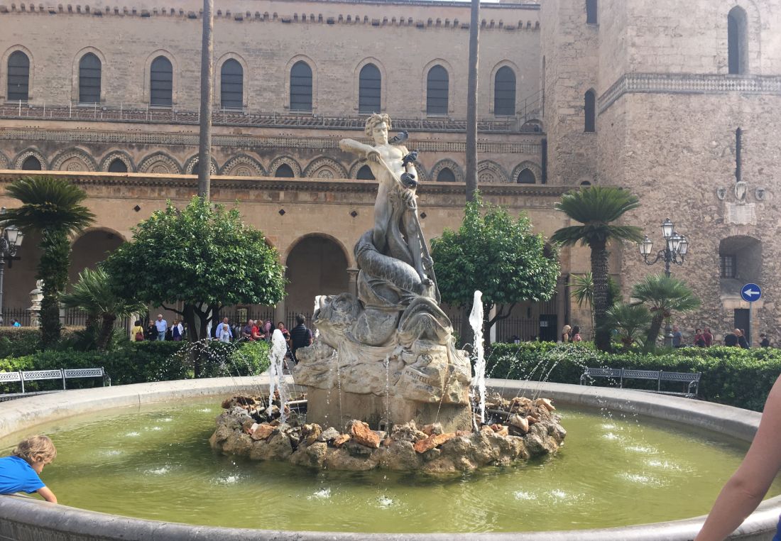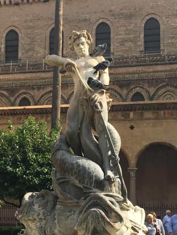 Triton fountain at the center of Piazza Vittorio Emanuele, sculpted in 1881 by Mario Rutelli is right in front of the entrance of the cathedral.