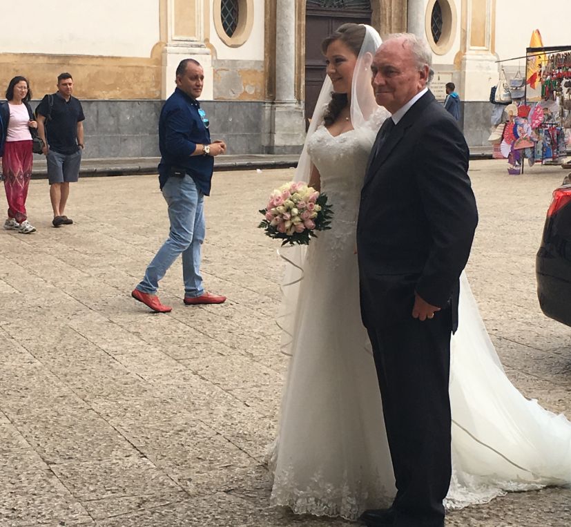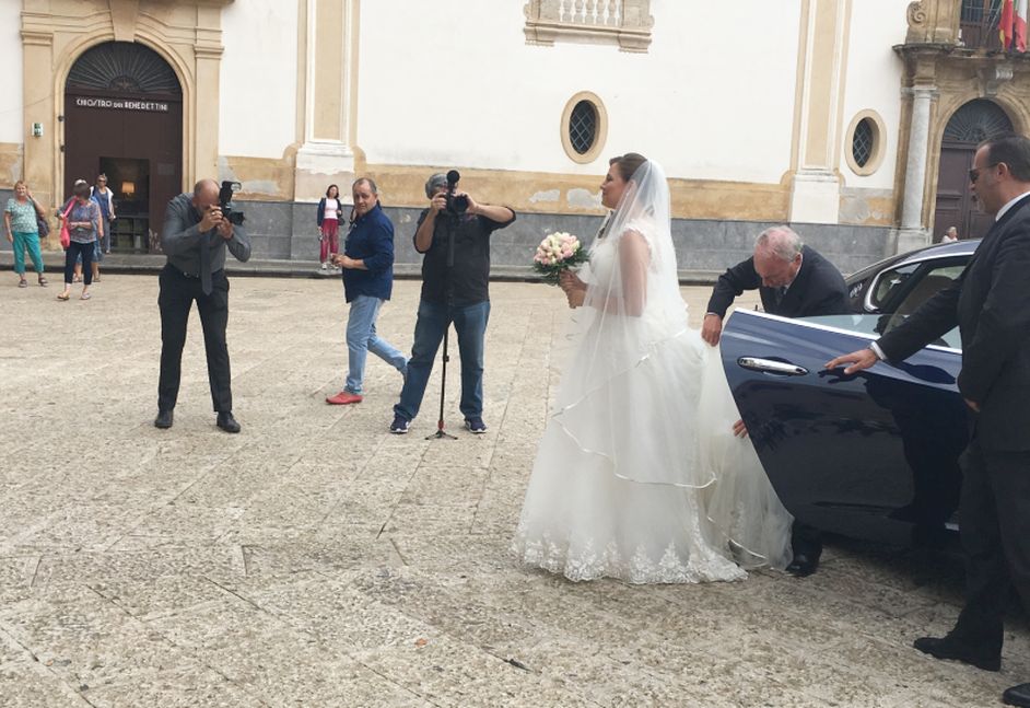 The father of the bride fixing her dress while photographers are taking her pictures.