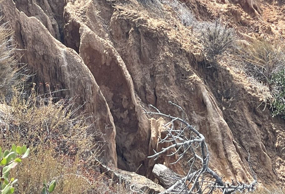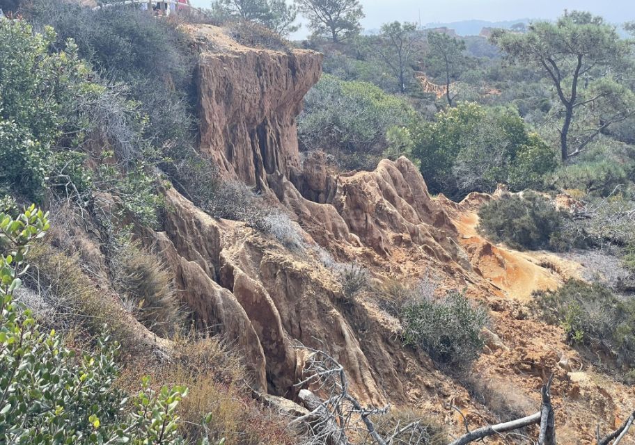 This terrain is one of the most iconic geological features of Torrey Pines! What you are looking at is a prime example of badlands topography carved into the Torrey Sandstone and the Linda Vista Formation. This is a very fragile landscape. Because the sandstone is held together so loosely, even a footprint can cause a mini-landslide and destroy shapes that took decades to form. This is exactly why fences are so important so that people cannot access the area.