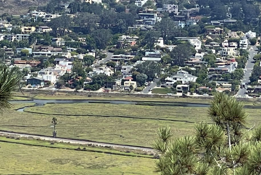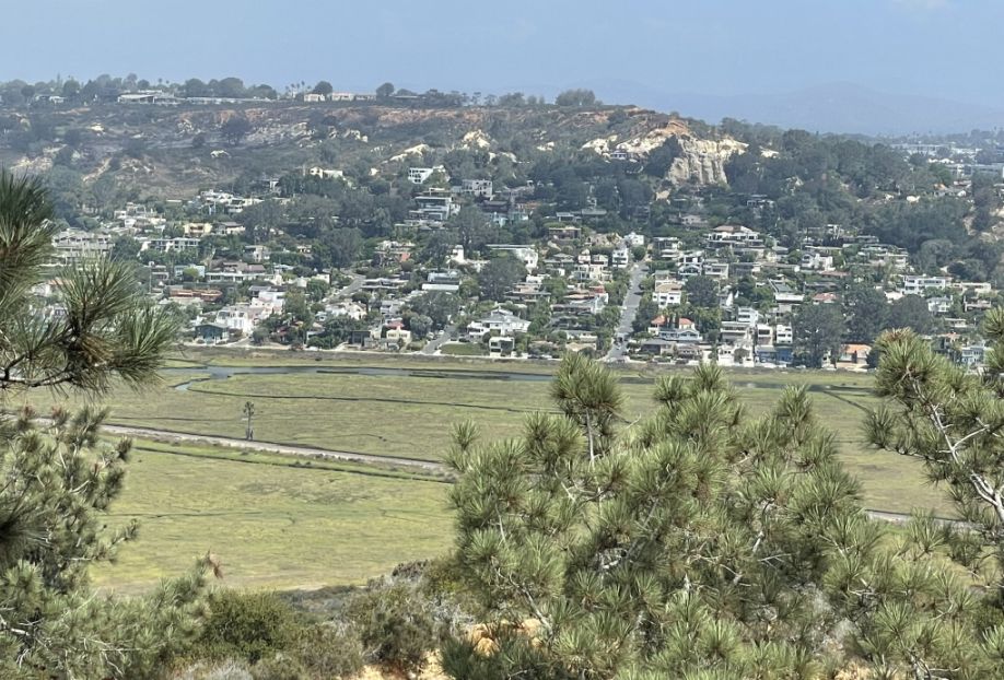 You can clearly see Los Peñasquitos Lagoon, the large, flat expanse of water and marshland directly below you is a vital coastal salt marsh. It serves as a nursery for fish and a resting spot for migratory birds. And then so many homes that are part of the Del Mar and Carmel Valley areas. They sit on the surrounding ridges that overlook the lagoon, illustrating how closely the residential neighborhoods press up against this protected wild space.