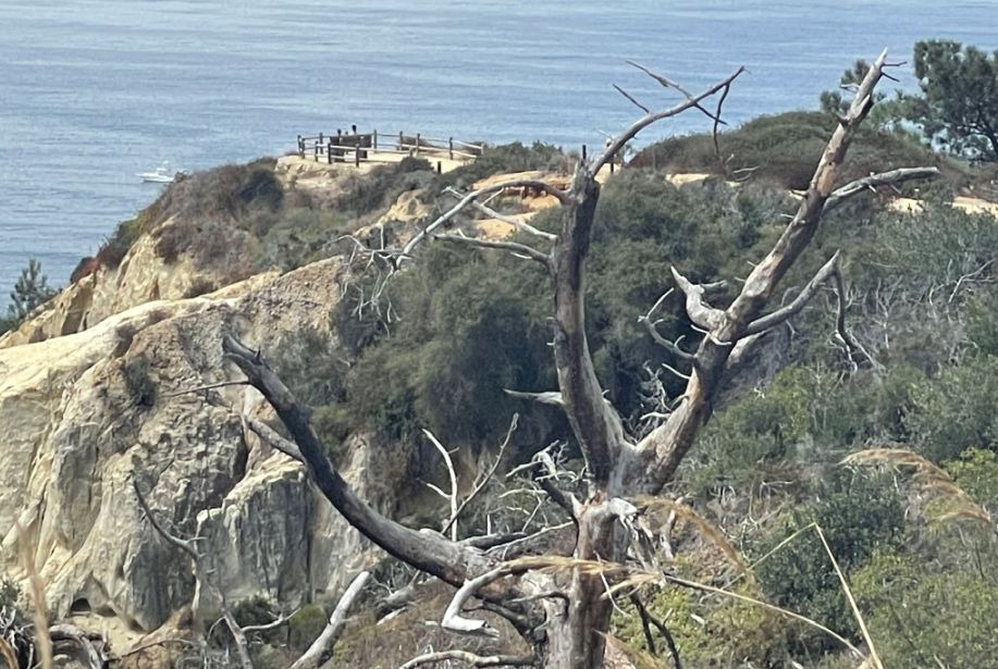 We reached the High Point Overlook, where the trail levels out and the space feels calm and enclosed by trees. Around us, the Torrey pines frame the view, their branches twisted by wind and time. One dead tree stands quietly among them, its pale trunk stark against the greenery, a reminder of how exposed and weathered this place can be.