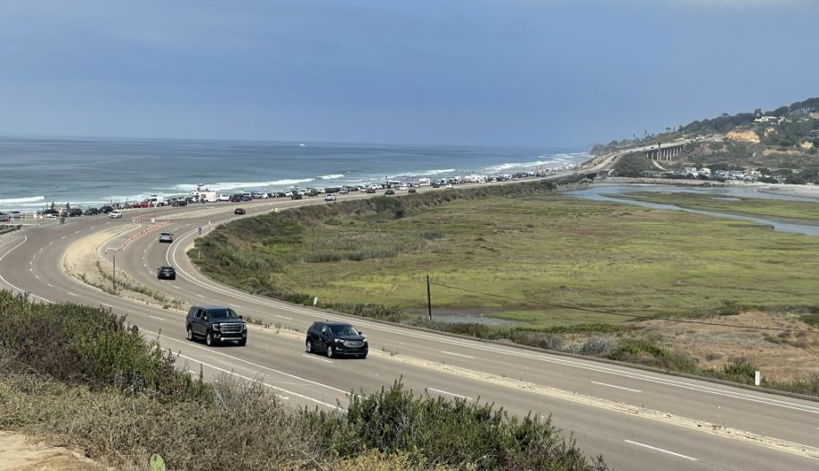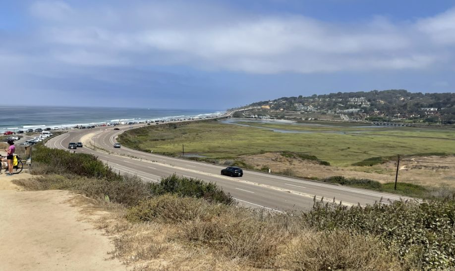 The "freeway" look-alike you see is likely North Torrey Pines Road (the historic Highway 101) or the Interstate 5 further inland, alongside the Coaster/Amtrak railway tracks that hug the coastline.