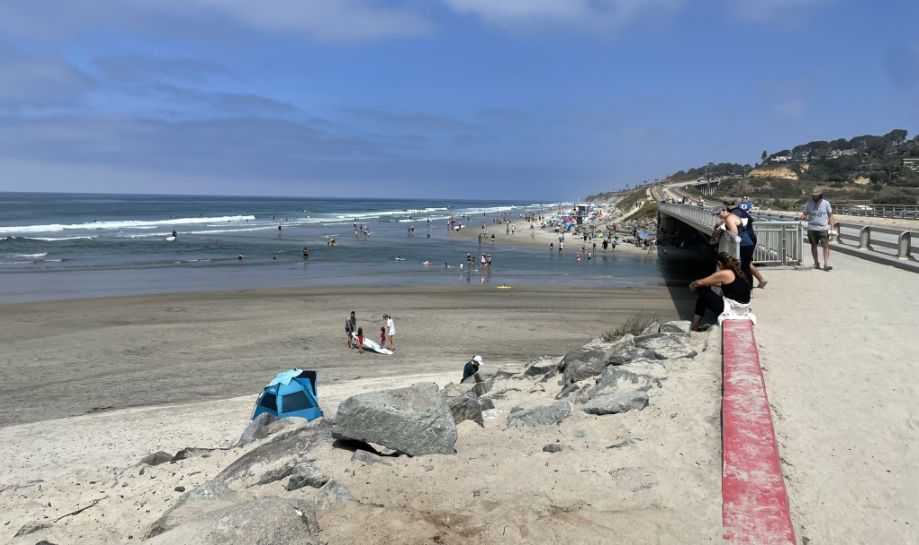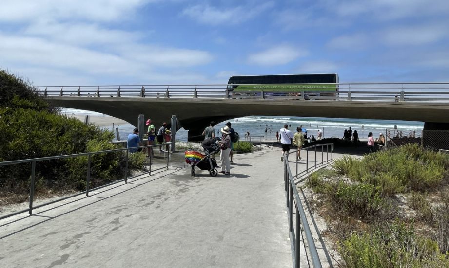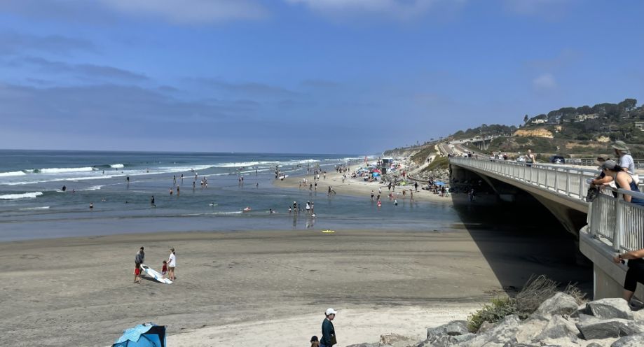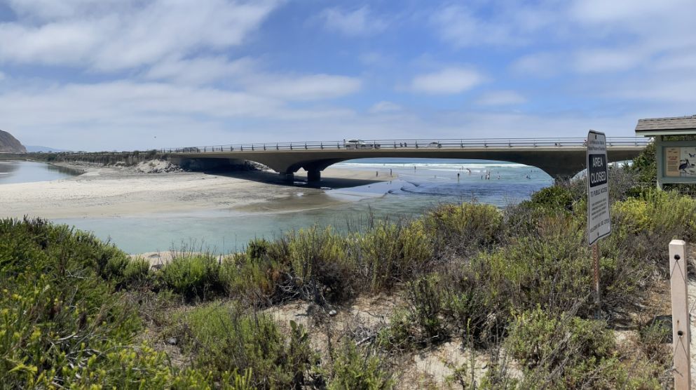 Straight ahead is the North Torrey Pines Bridge, which spans the channel where the Los Peñasquitos Lagoon meets the Pacific Ocean. The prominent beach between the lagoon and the ocean is a natural barrier. During certain times of the year, park rangers or heavy machinery have to manually clear sand from this opening to ensure the lagoon stays oxygenated and healthy for the fish and birds.