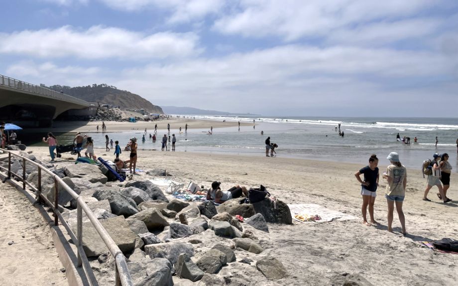 To the right thee "raised platform" you see is a San Diego State Lifeguard tower. During the summer and busy weekends, this area is heavily monitored because the currents where the lagoon drains into the ocean can be surprisingly strong, even if the water looks shallow.