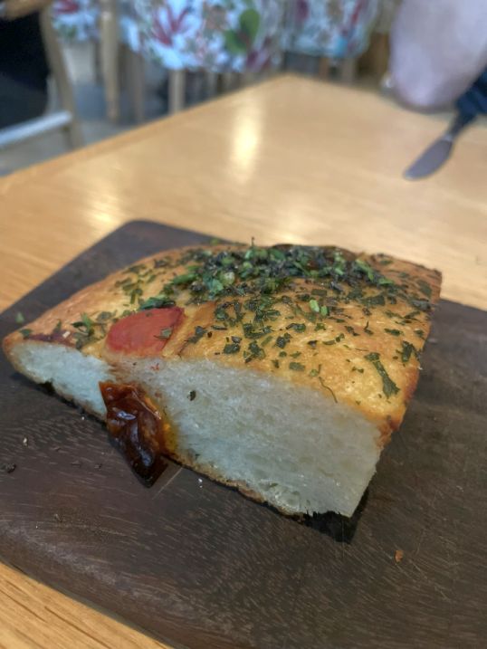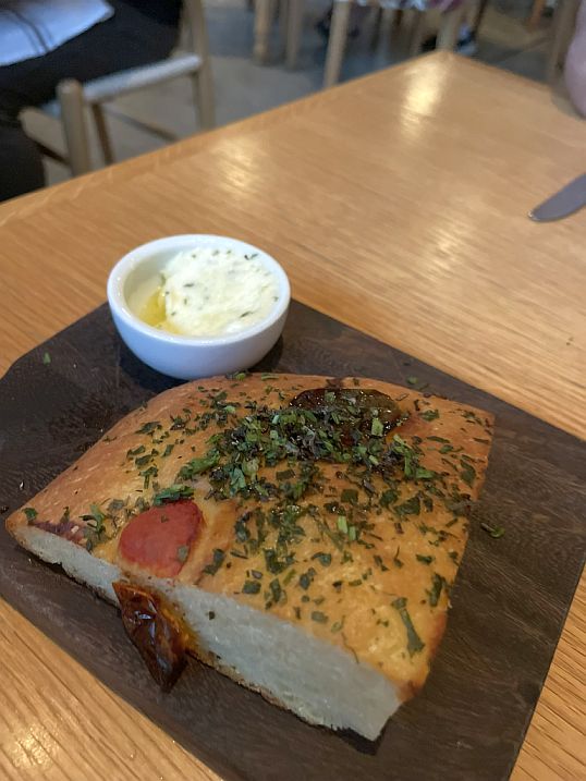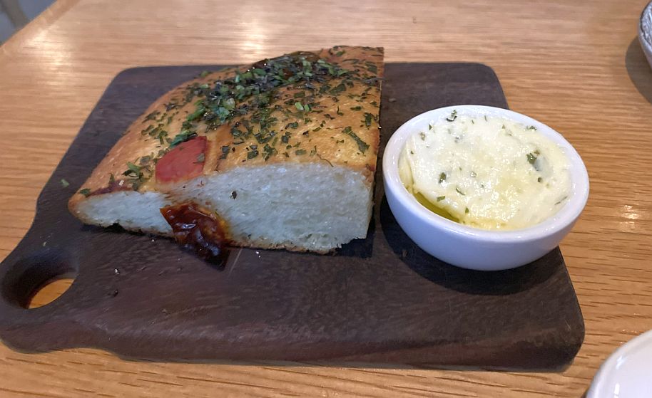 Next came the house-made roasted garlic focaccia, warm, pillowy, and impossible to resist, served with cultured herb butter and a sprinkle of sea salt that made each bite deeply satisfying.