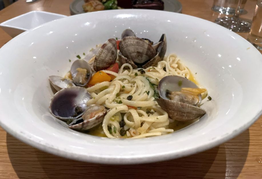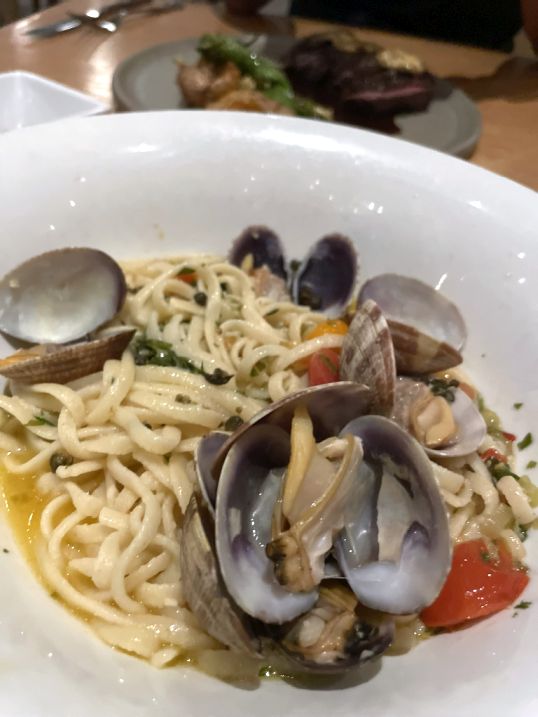 For our main dishes, we shared the shrimp puttanesca linguine, rich and savory with Castelvetrano olives, capers, Calabrian chili, and tomato, bold, briny, and comforting all at once.