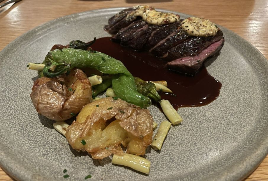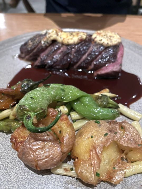Alongside it was a beautifully cooked New York strip steak, finished with a red wine reduction and accompanied by blistered shishito peppers, wax beans, and crispy smashed potatoes that added just the right amount of texture and contrast.