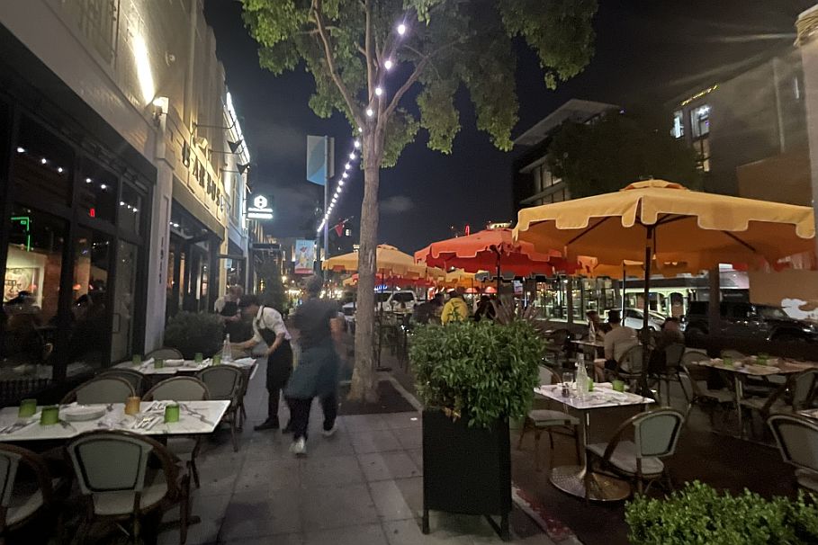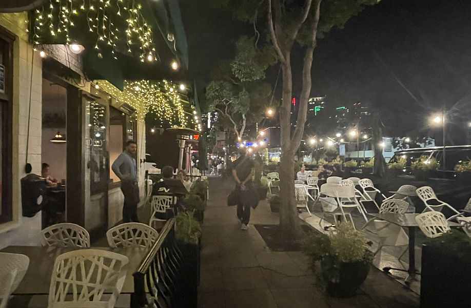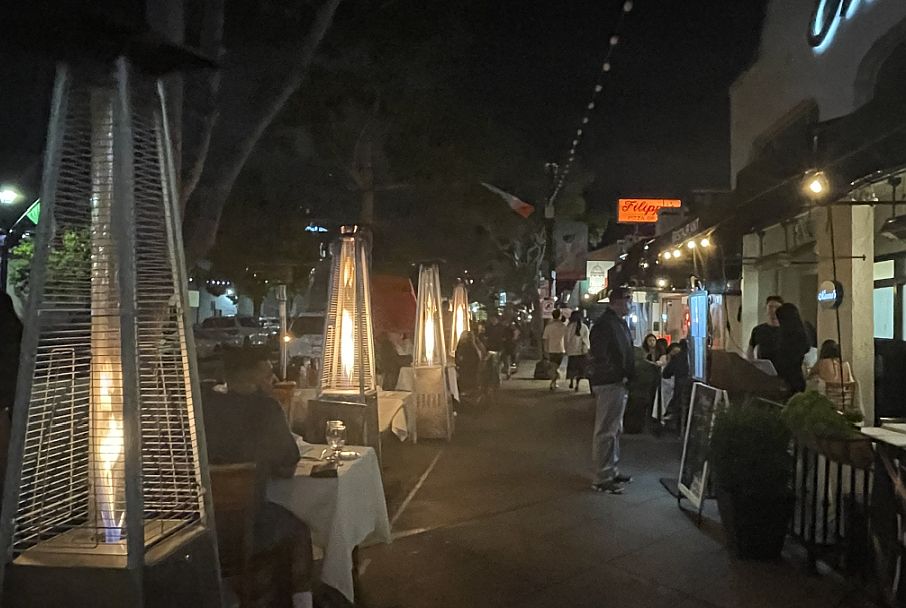 We are now on India Street and at night it is defined by a dense canopy of bistro lights.