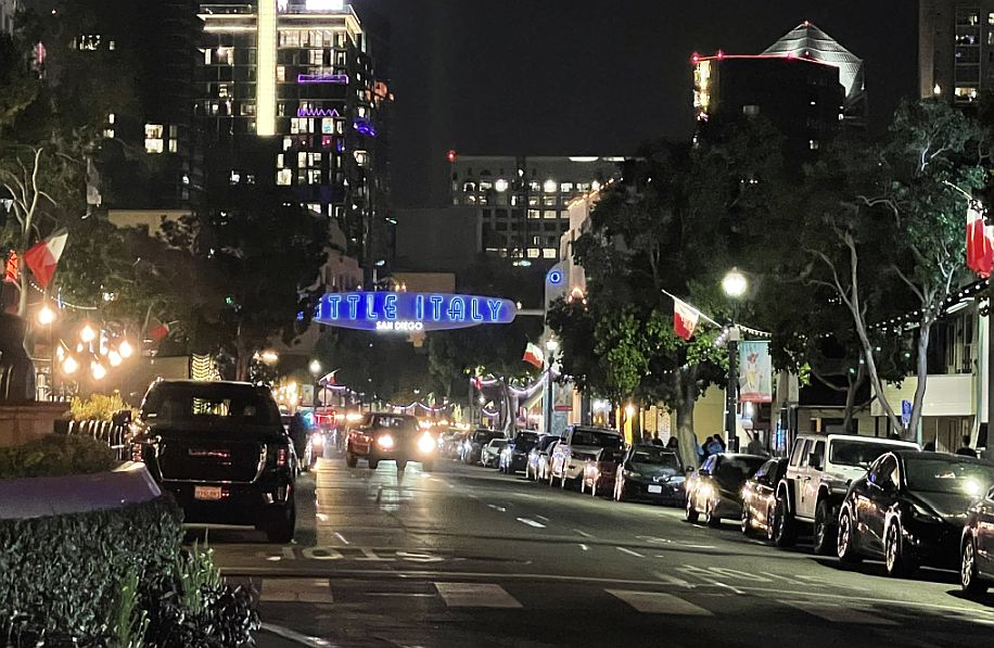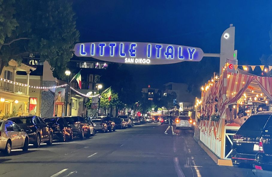 The streets grow busier, and then we see it, the large illuminated “Little Italy” sign suspended above the street.