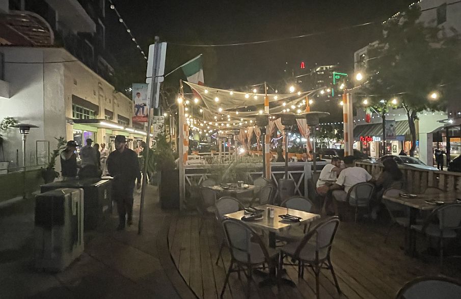 Open-air wooden platforms that extend the restaurant seating right onto the sidewalk.