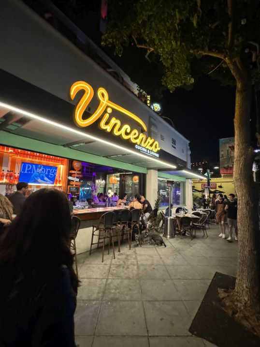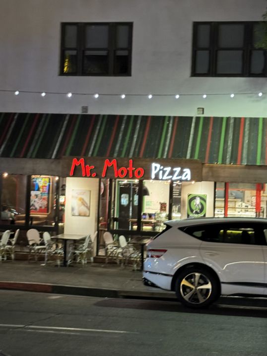 From there, the streets come alive quickly. Shops and restaurants line both sides, their bold neon signs glowing against the night: Vincenzo, Mr. Moto Pizza, etc..