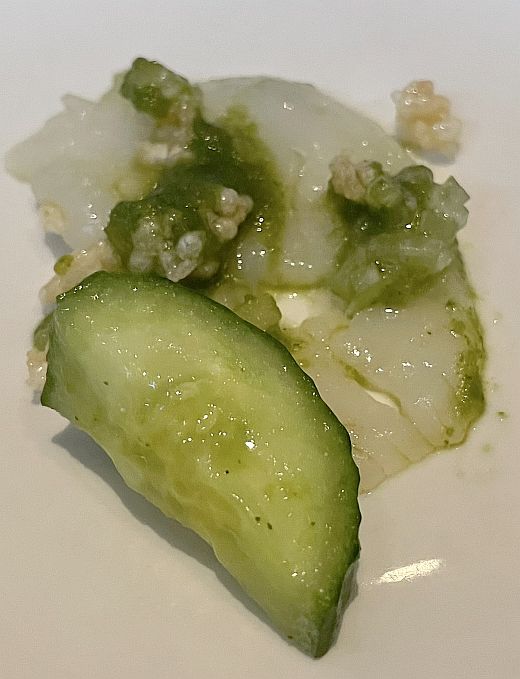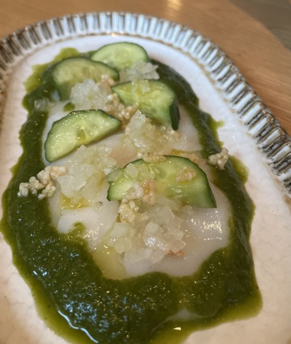 We started with the hamachi crudo, delicately sliced and brightened with fresh cucumber, crunchy bits of crispy rice, and a jalapeño-cilantro emulsion that tasted like a vibrant, herb-forward salsa verde. It was light, fresh, and quietly complex.