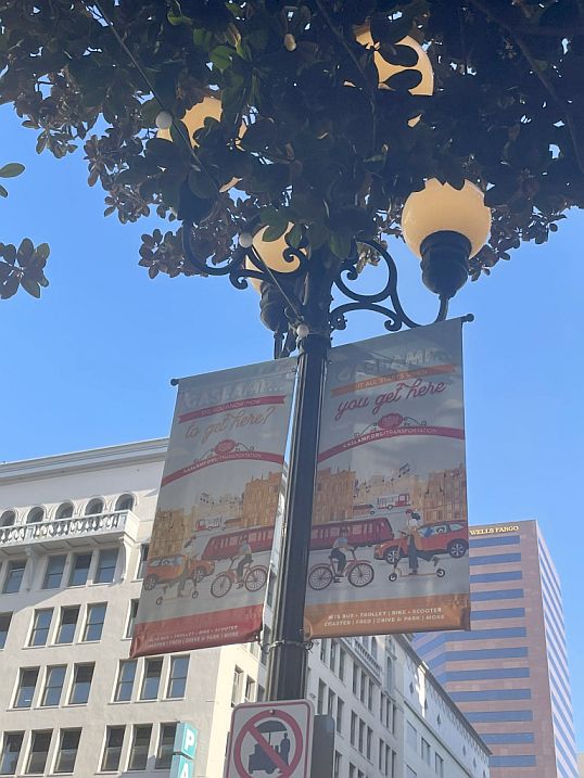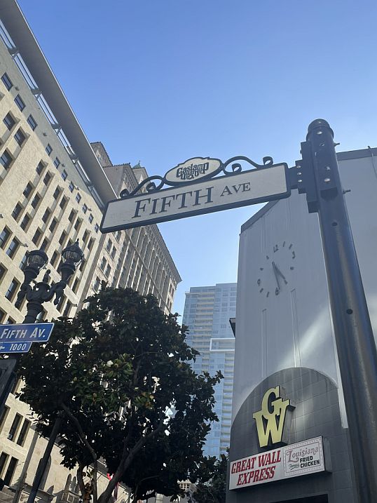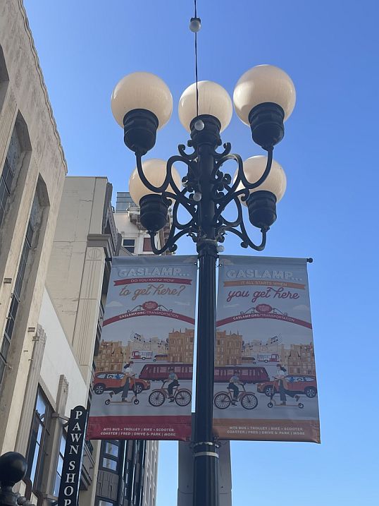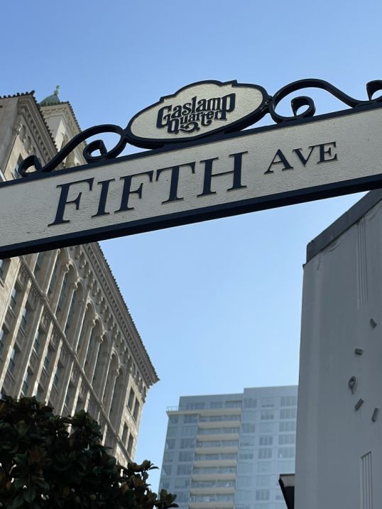 Starting on Fifth Avenue, the Gaslamp Quarter sign hangs right beneath the street sign like a welcome banner, marking the gateway to San Diego’s historic heart.