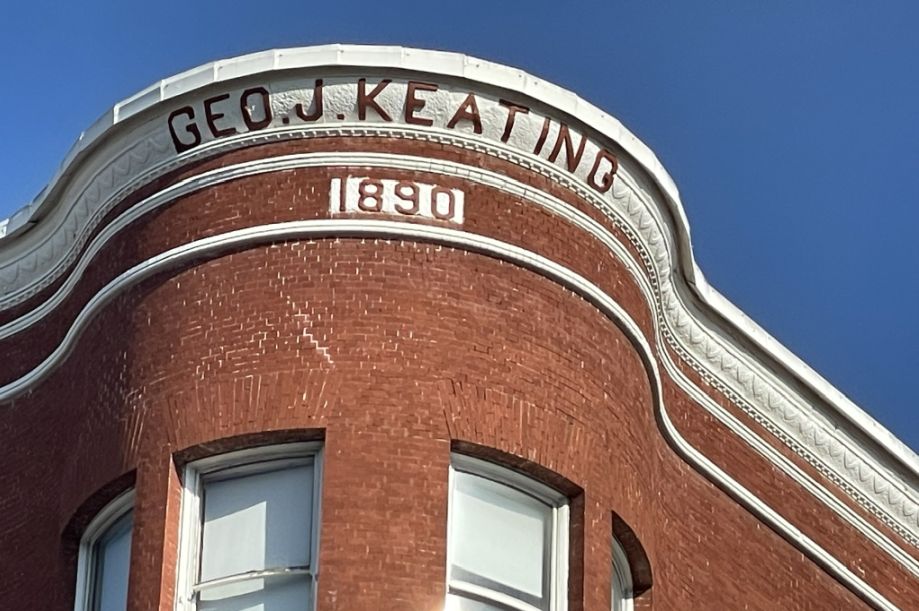 The tall red brick building is the Keating Hotel, a luxury boutique hotel.