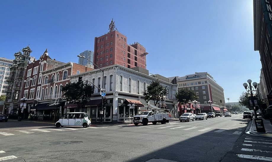The white building is called the Liewelyn building, two-story corner building in the foreground with arched windows currently houses Gyu-kaku Japanes BBQ.