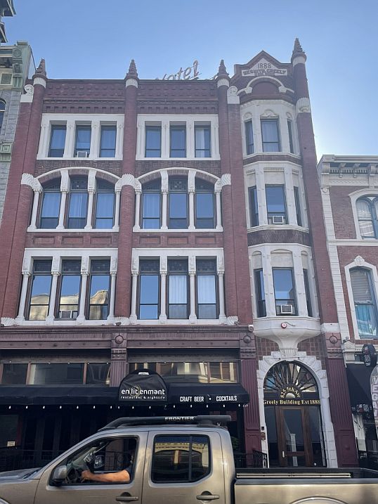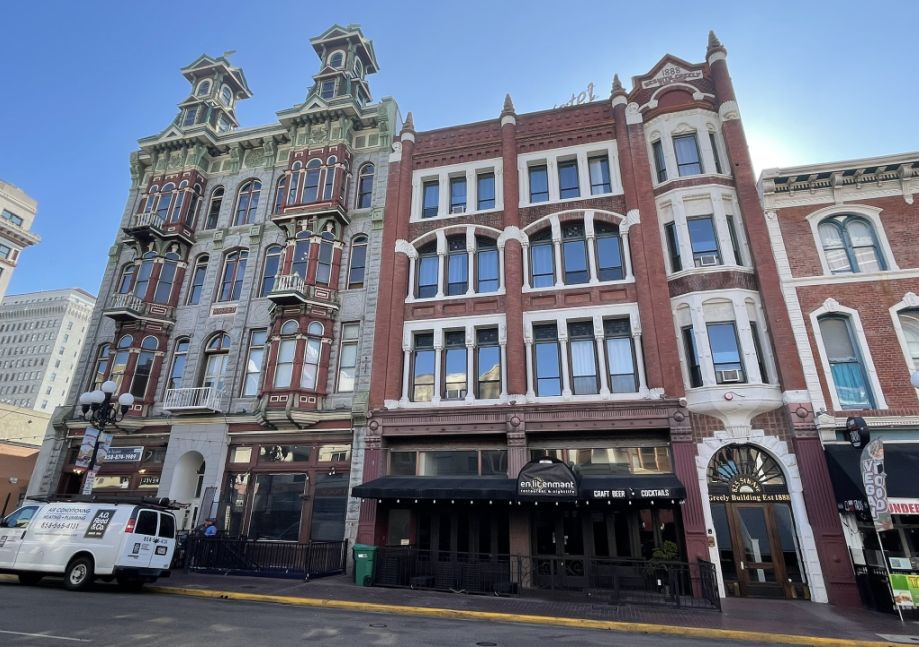 On the left is the Louis Bank of Commerce featuring beautiful arched windows and intricate detailing that made it a symbol of luxury and progress during the 1880s boom. It primarily houses creative office spaces and high-end retail on the ground floor.