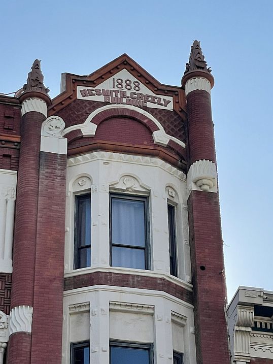 On the right is the Nesmith-Greely Building with its massive brickwork.