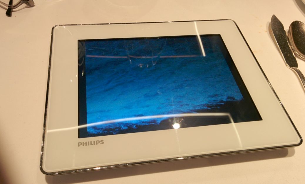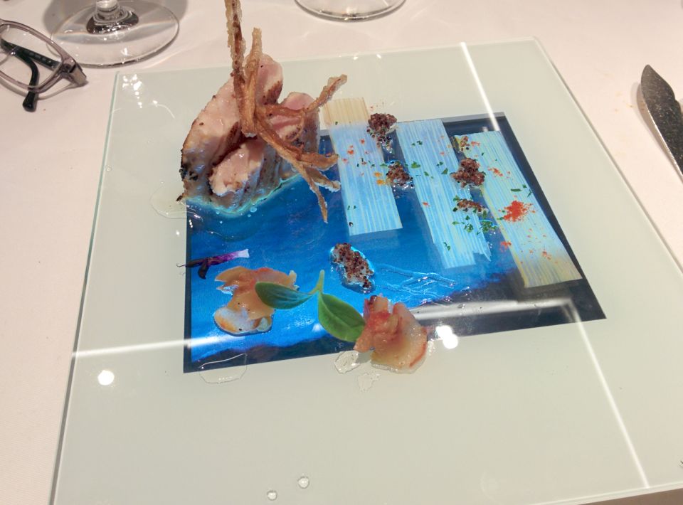..then the waiter proceeded to put a huge clear see through glass plate on top of the I-pad. A bit whimsical but it is entertaining as you can eat your monkfish while looking and hearing the sound of waves crashing on a shore right in front of you.