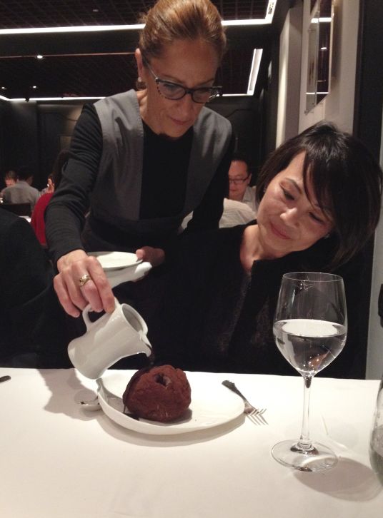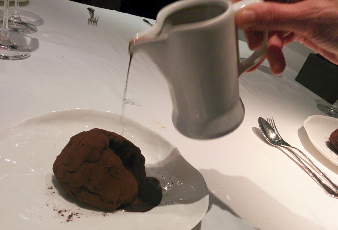 Our waitress pouring the chocolate sauce over the big Truffle.